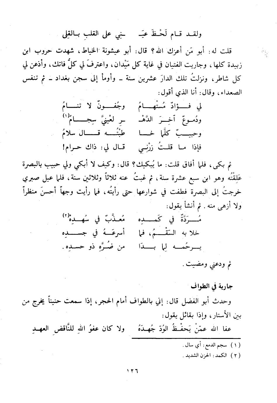 ثم بكى، فلما أفاق قلت: ما يبكيك؟ قال: وكيف لا أبكي ولي حبيب بالبصرة علقته وهو ابن سبع عشرة سنة، ثم غبت عنه ثلاثا وثلاثين سنة، فلما عيل صبري خرجت إلى البصرة فطفت في شوارعها حتى رأيته، فما رأيت وجها أحسن منظرا ولا أزهى منه. ثم أنشأ يقول: