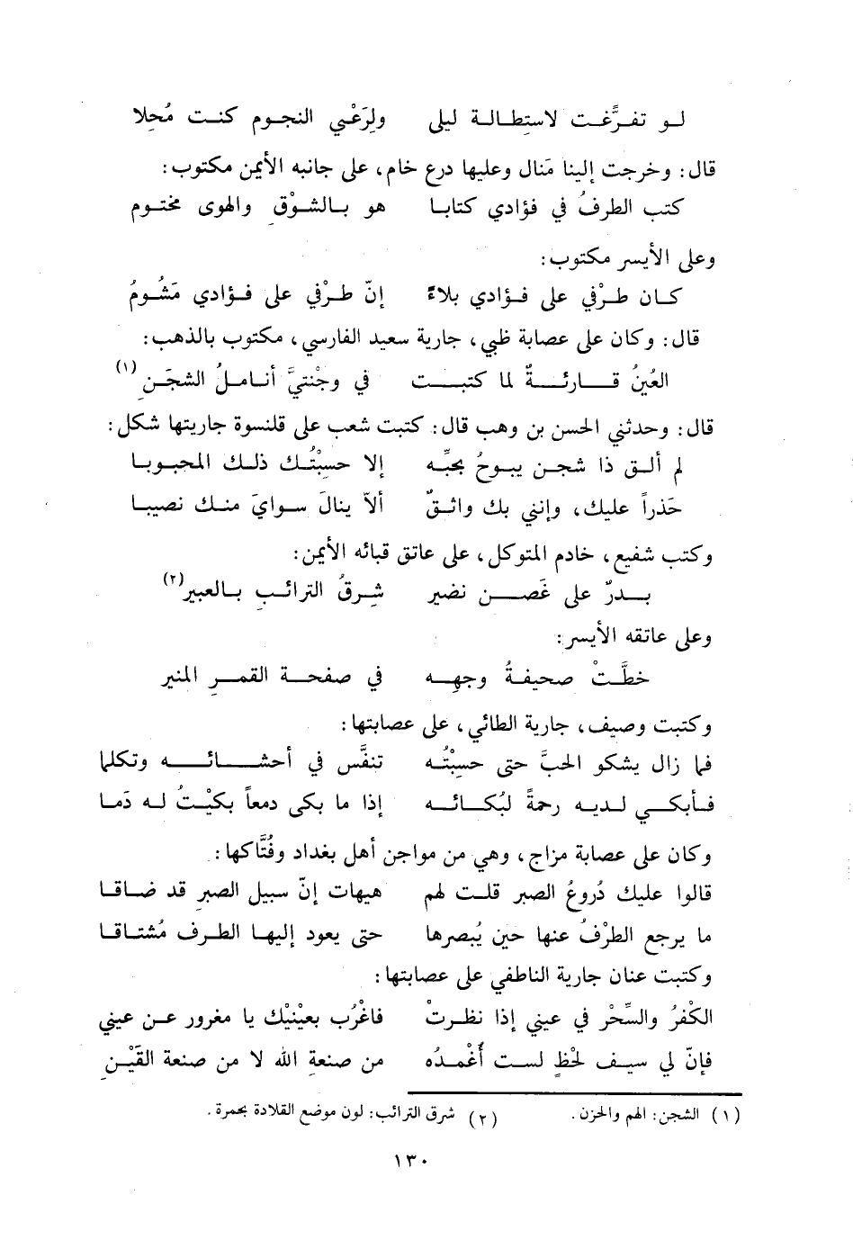 قال: وحدثني الحسن بن وهب قال: كتبت شعب على قلنسوة جاريتها شكل:
