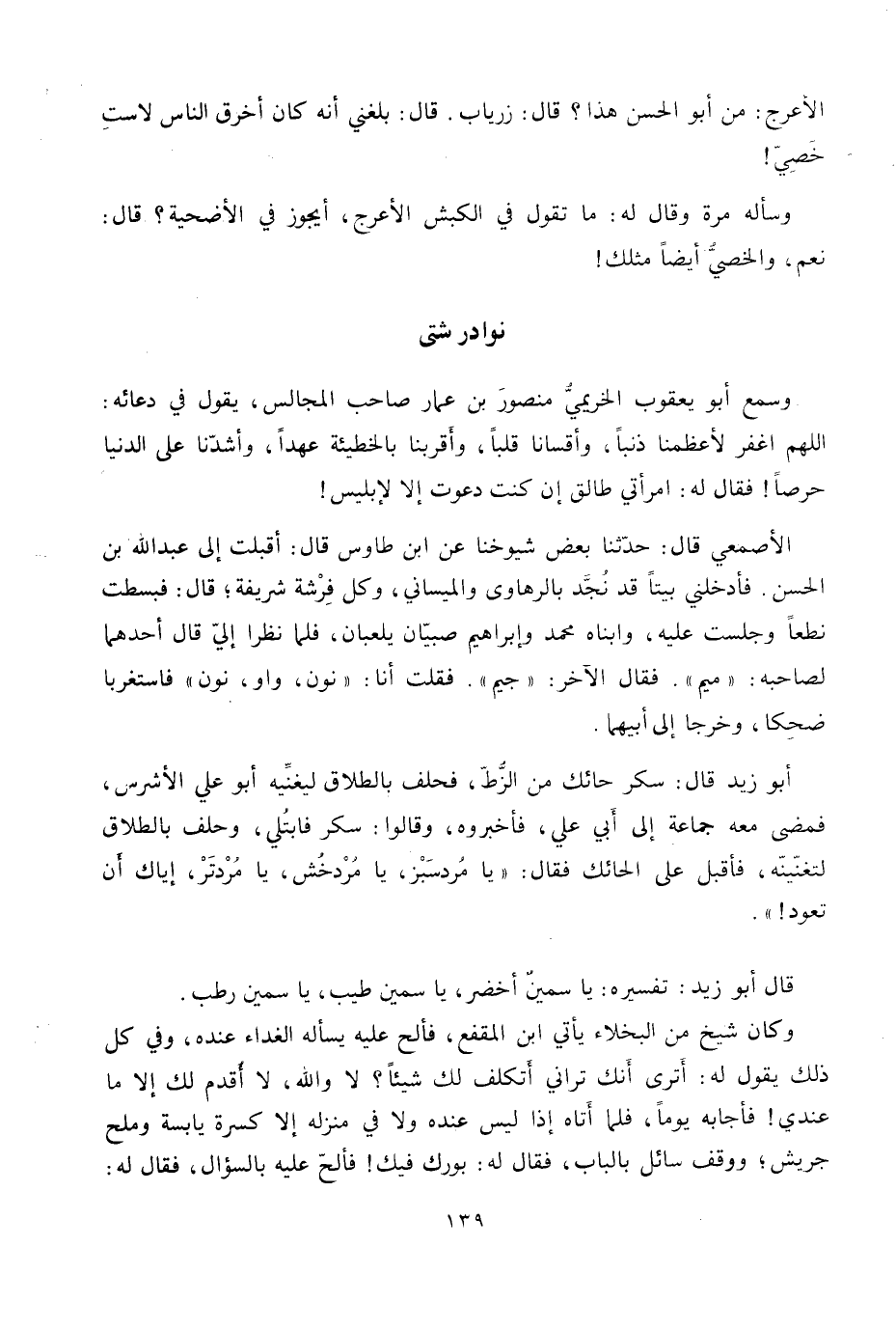 اللهم اغفر لأعظمنا ذنبا، وأقسانا قلبا، وأقربنا بالخطيئة عهدا، وأشدّنا على الدنيا حرصا! فقال له: امرأتي طالق إن كنت دعوت إلا لإبليس! الأصمعي قال: حدّثنا بعض شيوخنا عن ابن طاوس قال: أقبلت إلى عبد اللَّه بن الحسن. فأدخلني بيتا قد نجّد بالرهاوى والميساني، وكل فرشة شريفة؛ قال: فبسطت نطعا وجلست عليه، وابناه محمد وإبراهيم صبيّان يلعبان، فلما نظرا إليّ قال أحدهما لصاحبه: «ميم» . فقال الآخر: «جيم» . فقلت أنا: «نون، واو، نون» فاستغربا ضحكا، وخرجا إلى أبيهما.