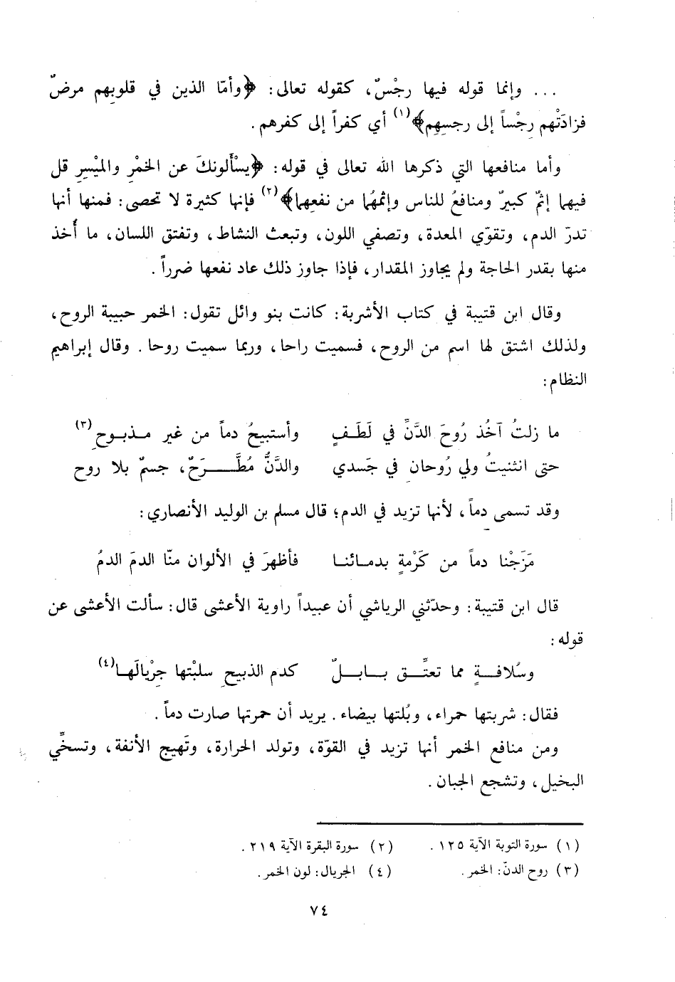 ومن منافع الخمر أنها تزيد في القوّة، وتولد الحرارة، وتهيج الأنفة، وتسخّي البخيل، وتشجع الجبان.