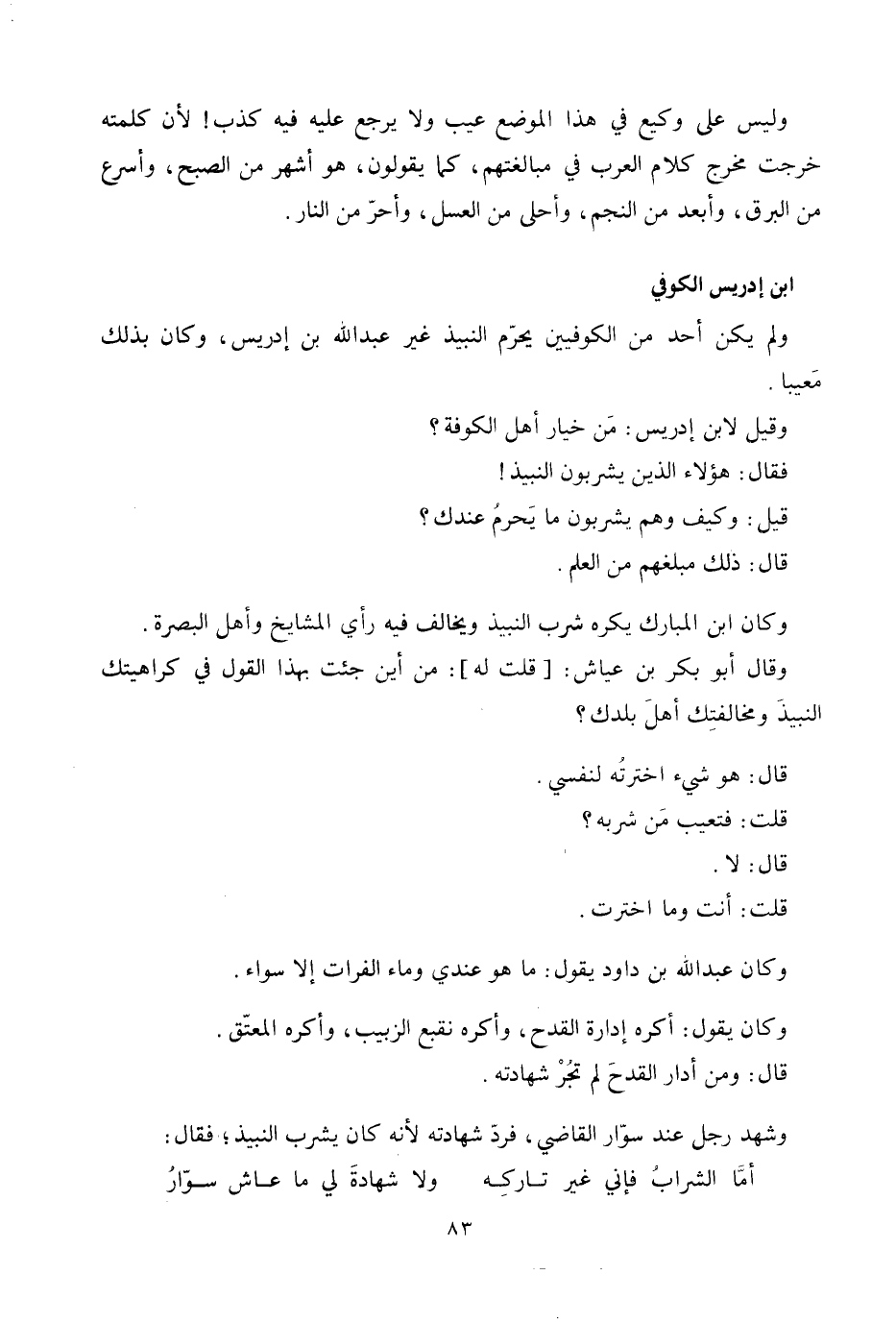 ولم يكن أحد من الكوفيين يحرّم النبيذ غير عبد اللَّه بن إدريس، وكان بذلك معيبا.