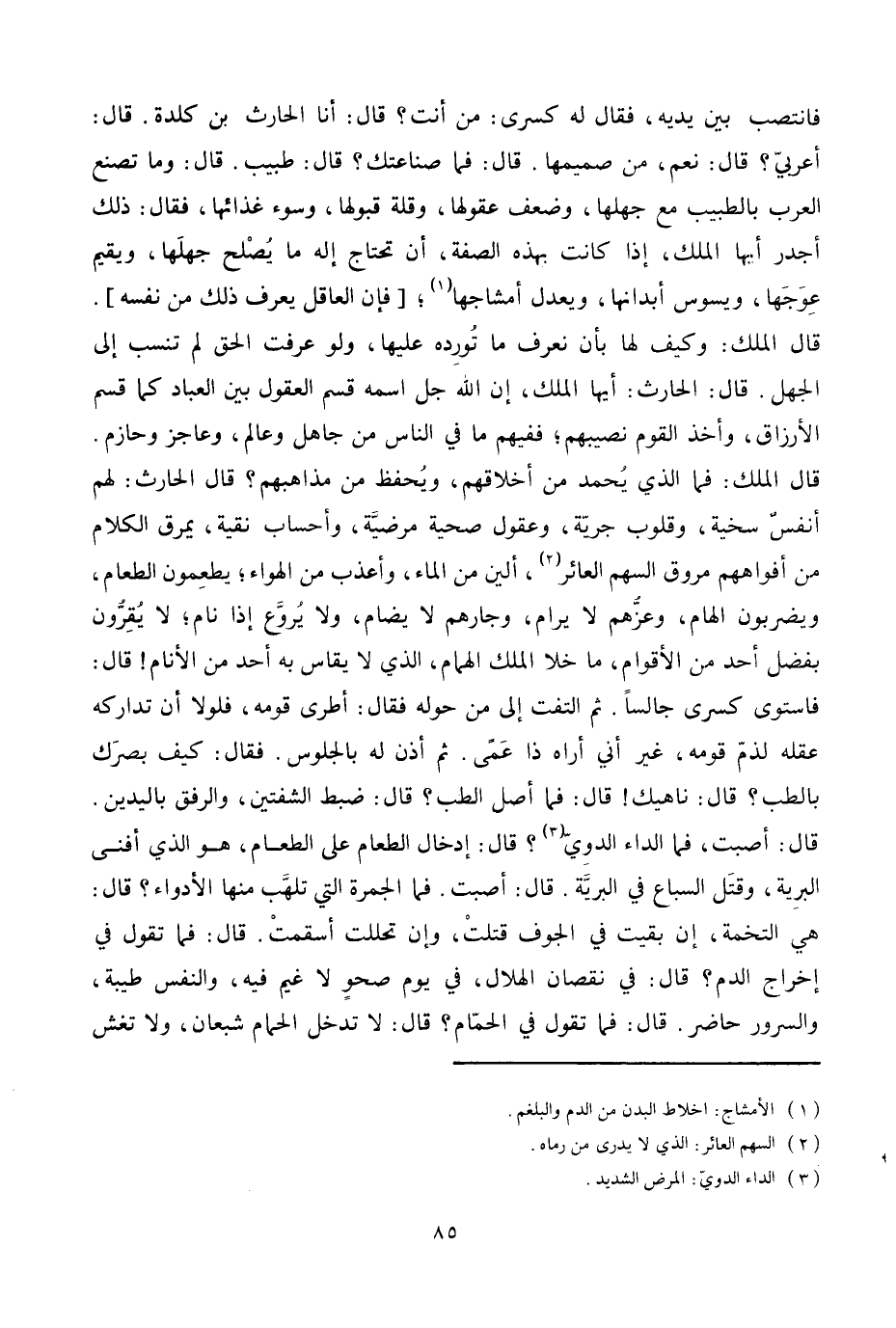 فاستوى كسرى جالسا. ثم التفت إلى من حوله فقال: أطرى قومه، فلولا أن تداركه عقله لذمّ قومه، غير أني أراه ذا عمى. ثم أذن له بالجلوس. فقال: كيف بصرك بالطب؟ قال: ناهيك! قال: فما أصل الطب؟ قال: ضبط الشفتين، والرفق باليدين.