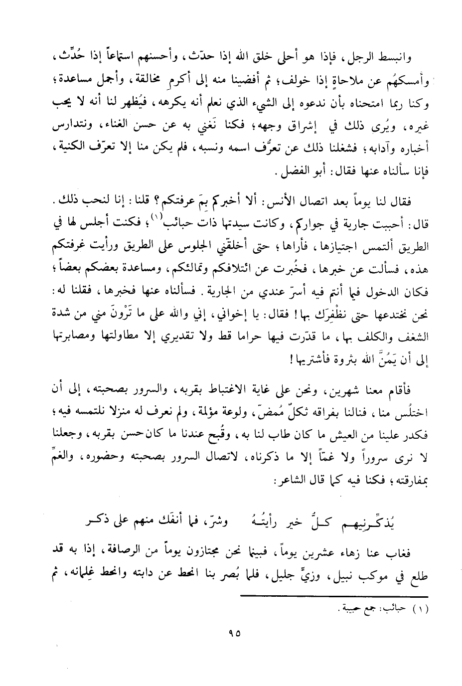 نحن نختدعها حتى نظفرك بها! فقال: يا إخواني، إني واللَّه على ما ترون مني من شدة الشغف والكلف بها، ما قدّرت فيها حراما قط ولا تقديري إلا مطاولتها ومصابرتها إلى أن يمنّ اللَّه بثروة فأشتريها! فأقام معنا شهرين، ونحن على غاية الاغتباط بقربه، والسرور بصحبته، إلى أن اختلس منا، فنالنا بفراقه ثكل ممضّ، ولوعة مؤلمة، ولم نعرف له منزلا نلتمسه فيه؛ فكدر علينا من العيش ما كان طاب لنا به، وقبح عندنا ما كان حسن بقربه، وجعلنا لا نرى سرورا ولا غمّا إلا ما ذكرناه، لاتصال السرور بصحبته وحضوره، والغمّ بمفارقته؛ فكنا فيه كما قال الشاعر: