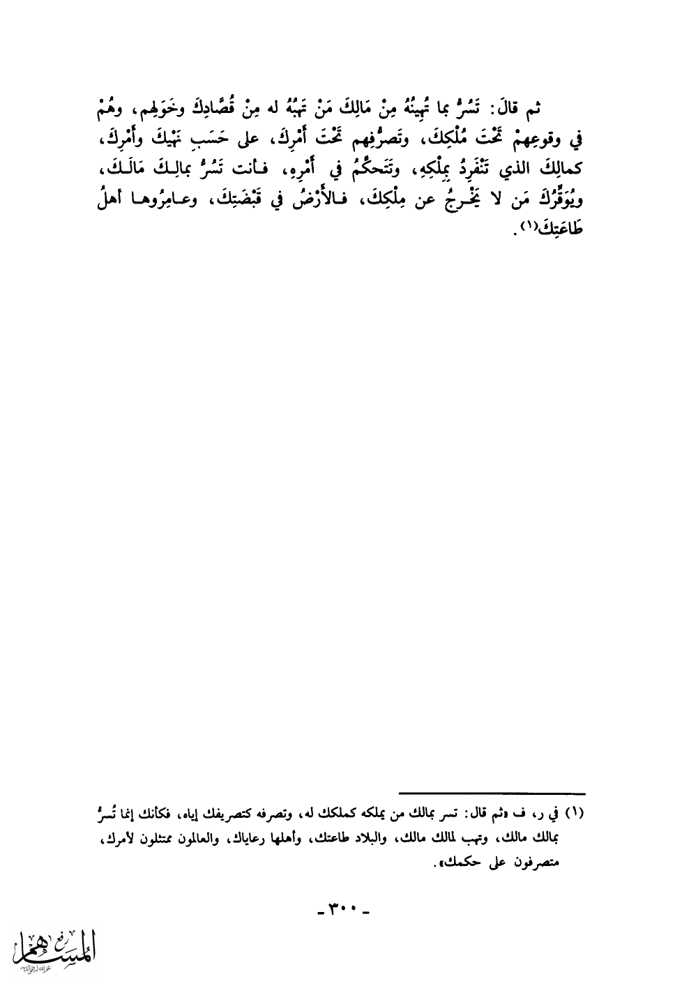 ثم قال: تسر بما تهينه من مالك من تهبه له من قصادك وخولهم، وهم في وقوعهم تحت ملكك، وتصرفهم تحت أمرك، على حسب نهبك وأمرك، كمالك الذي تنفرد بملكه، وتتحكم في أمره، فأنت تسر بمالك مالك، ويوقرك من لا يخرج عن ملكك، فالأرض في قبضتك، وعمروها أهل طاعتك.