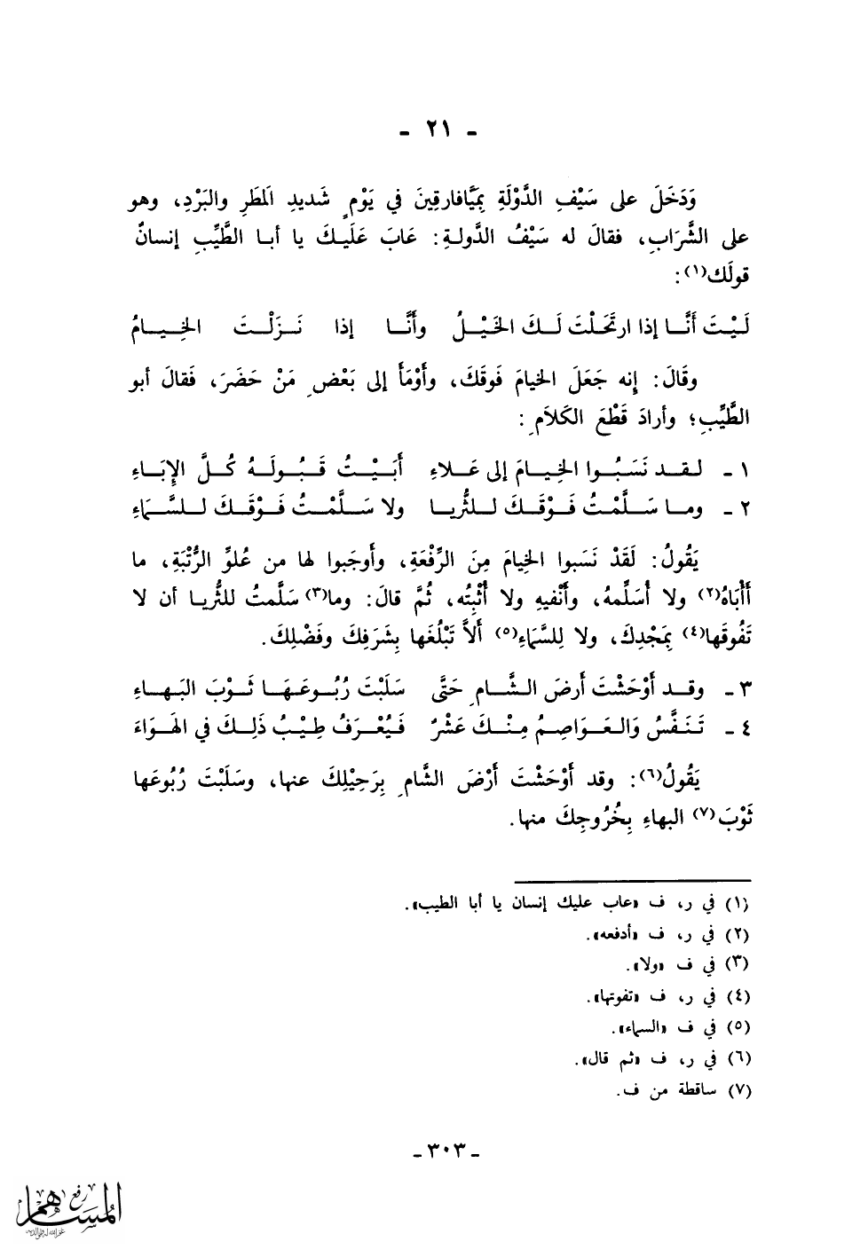 ودخل على سيف الدولة بميافارقين في يوم شديد المطر والبرد، وهو على الشراب، فقال له سيف الدولة: عاب عليك يا أبا الطيب إنسان قولك: