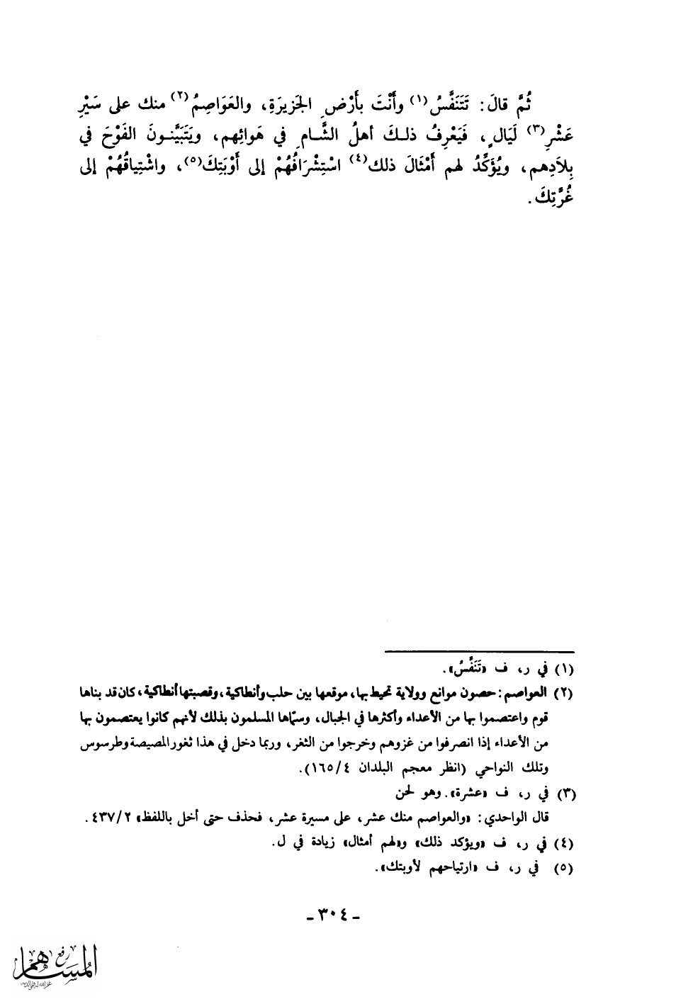 ثم قال: تتنفس وأنت بأرض الجزيرة، والعواصم منك على سير عشر ليال، فيعرف ذلك أهل الشام في هوائهم، ويتبينون الفوح في بلادهم، ويؤكد لهم أمثال ذلك استشرافهم إلى أوبتك، واشتياقهم إلى غرتك.