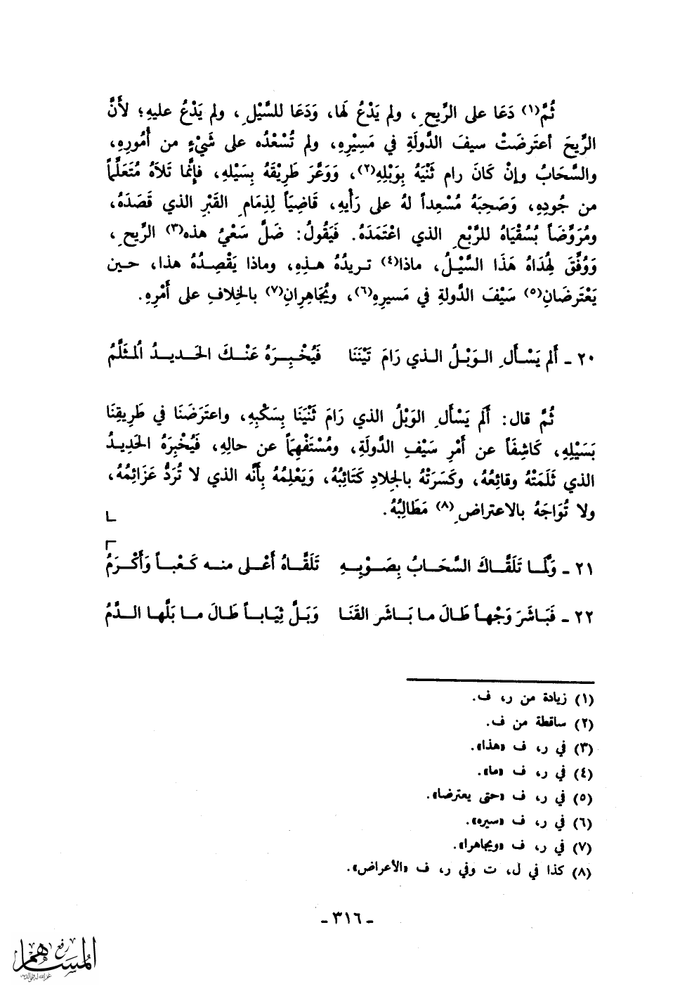 ثم قال: ألم يسأل الوبل الذي رام ثنينا بسكنه، واعترضنا في طريقنا بسيله، كاشفاً عن أمره سيف الدولة، ومستفهماً عن حاله، فيخبره الحديد الذي ثلمته وقائعه، وكسرته بالجلاد كتائبه، ويعلمه بأنه الذي لا يرد عزائمه، ولا تواجه بالاعتراض مطالبه.