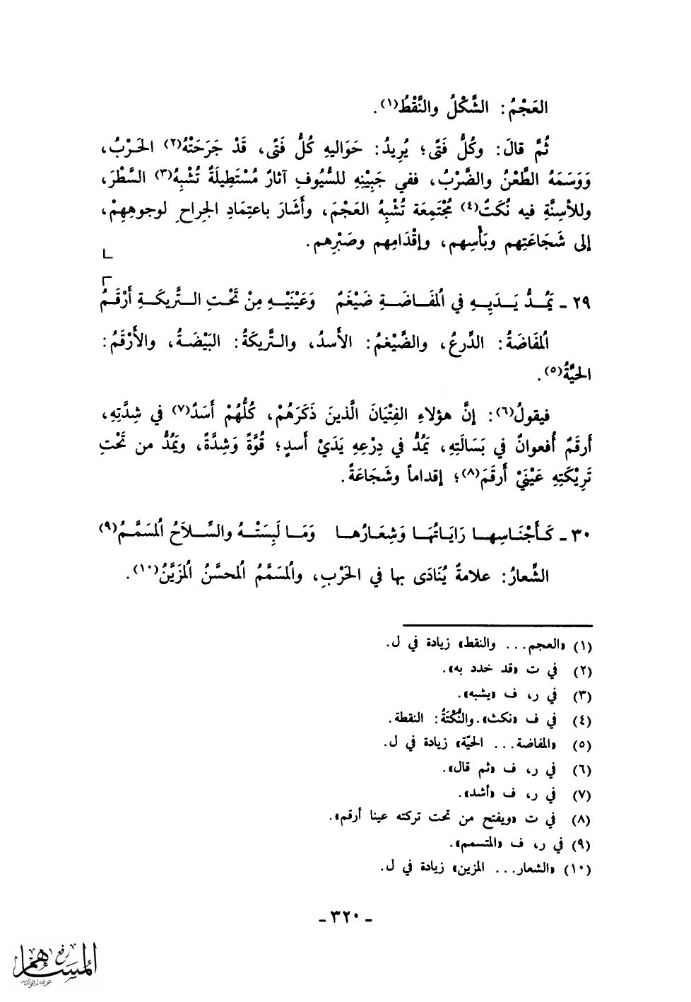 ثم قال: وكل فتى؛ يريد: كل فتى، قد جرحته الحرب، ووسمه الطعن والضرب، ففي جبينه للسيوف آثار مستطيلة تشبه السطر، وللأسنة فيه نكت مجتمعة تشبه العجم، وأشار باعتماد الجراح لوجوههم، إلى شجاعتهم وبأسهم، وإقدامهم وصبرهم.