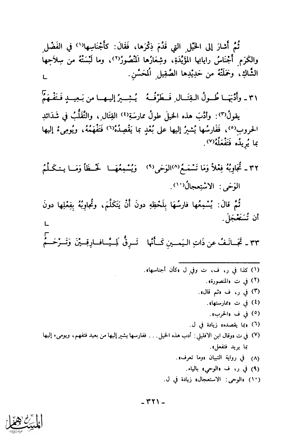 ثم أشار إلى الخيل التي قدم ذكرها، فقال: كأجناسها في الفضل والكرم أجناس راياتها المؤيدة، وشعارها المنصور، وما لبسته من سلاحها الشاك، وحملته من حديدها الصقيل المحسن.