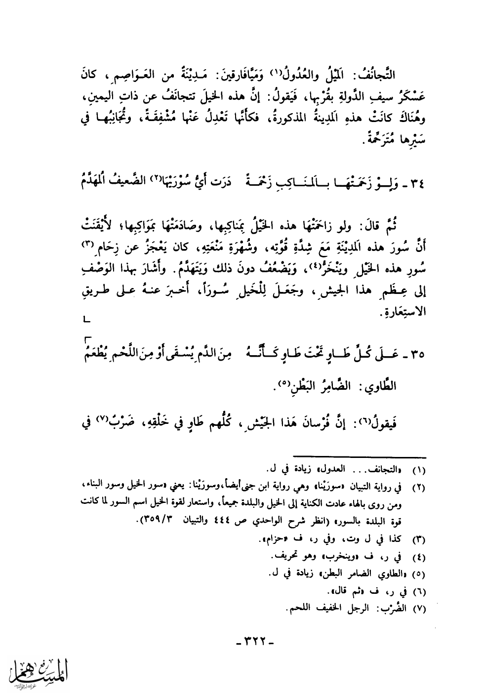 ثم قال: ولو زاحمتها هذه الخيل بمناكبها، وصادمتها بمواكبها؛ لأيقنت أن سور هذه المدينة مع شدة قوته، وشهرة منعته، كان يعجز عن زحام سورة هذه الخيل وينخر، ويضعف دون ذلك ويتهدم. وأشار بهذا الوصف إلى عظم هذا الجيش، وجعل سوراً، أخبر عنه على طريق الاستعارة.