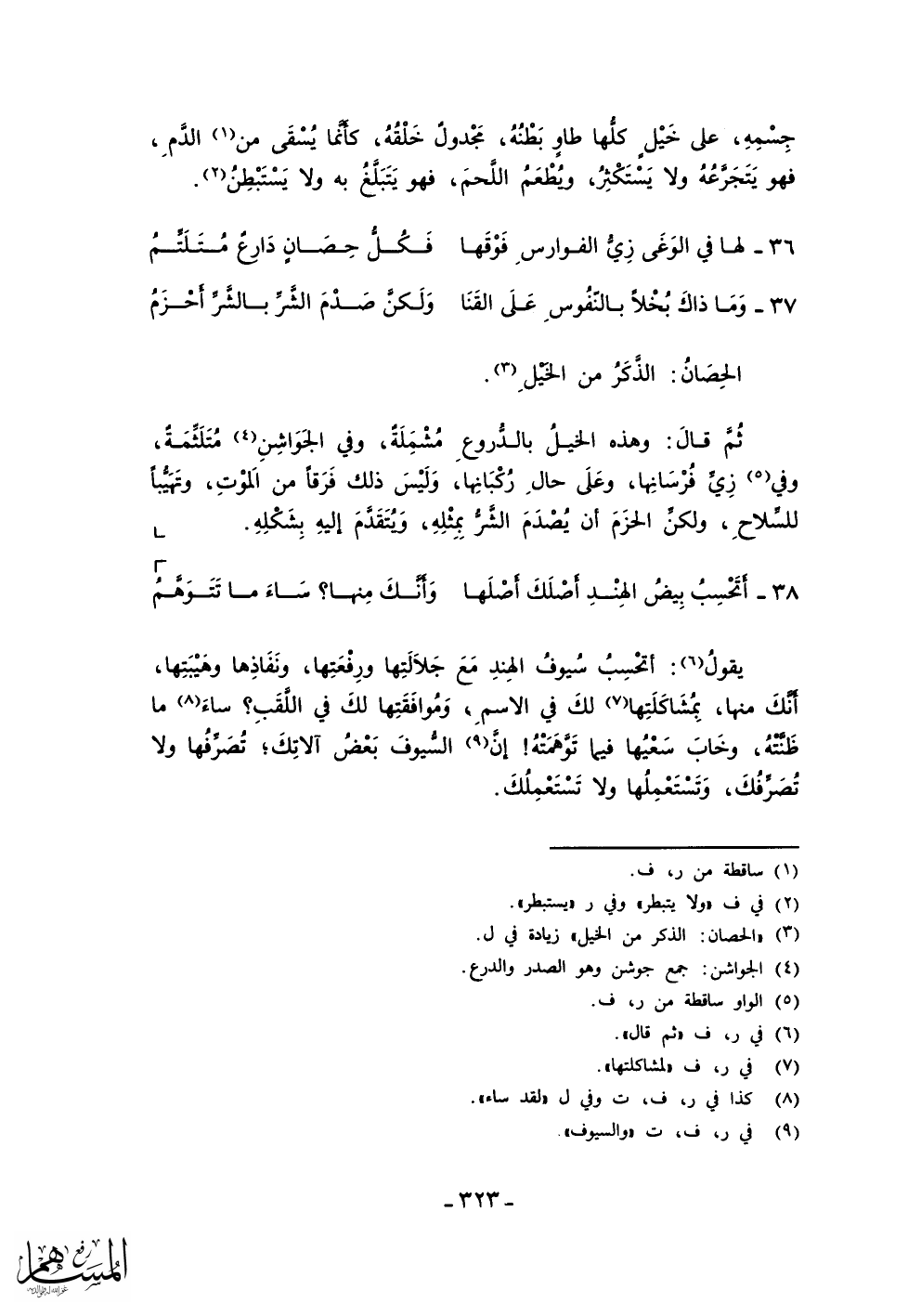 ثم قال: وهذه الخيل بالدروع مشتملة، وفي الجواشن متلثمة، وفي زي فرسانها، وعلى حال ركبانها، وليس ذلك فرقاً من الموت، وتهيباً للسلاح، ولكن الحزم أن يصدم الشر بمثله، ويتقدم إليه بشكله.