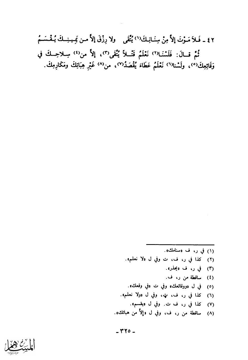 ثم قال: فلسنا نعلم قتلاً يتقى، إلا من سلاحك في وقائعك، ولسنا نعلم عطاء يقصد، من غير هباتك ومكارمك.