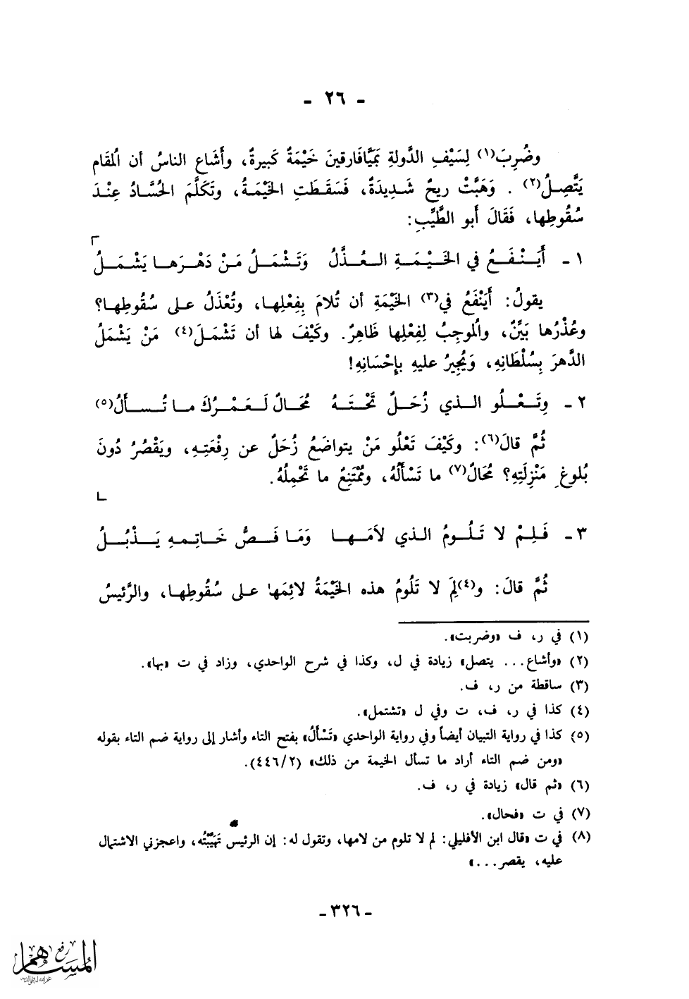 ثم قال: ولم لا تلوم هذه الخيمة لائمها على سقوطها، والرئيس