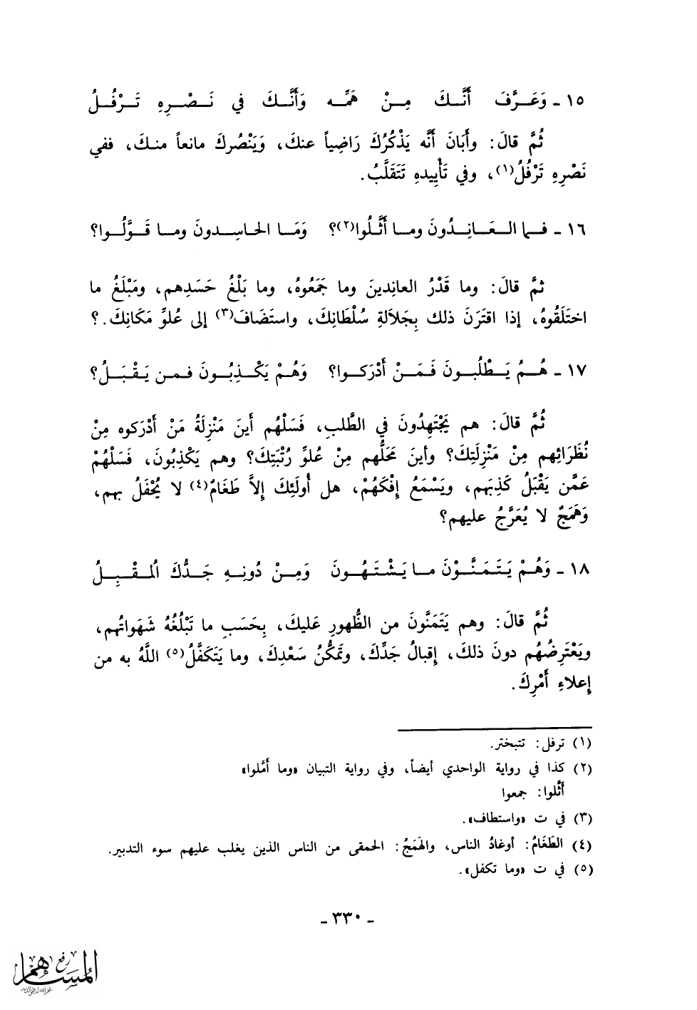 ثم قال: هم يجتهدون في الطلب، فسلهم أين منزلة من أدركوه من نظرائهم من منزلتك؟ وأين محلهم من علو رتبتك؟ وهم يكذبون، فسلهم عمن يقبل كذبهم، ويسمع إفكهم إلا طغام لا يحفل بهم، وهمج لا يعرج عليهم؟