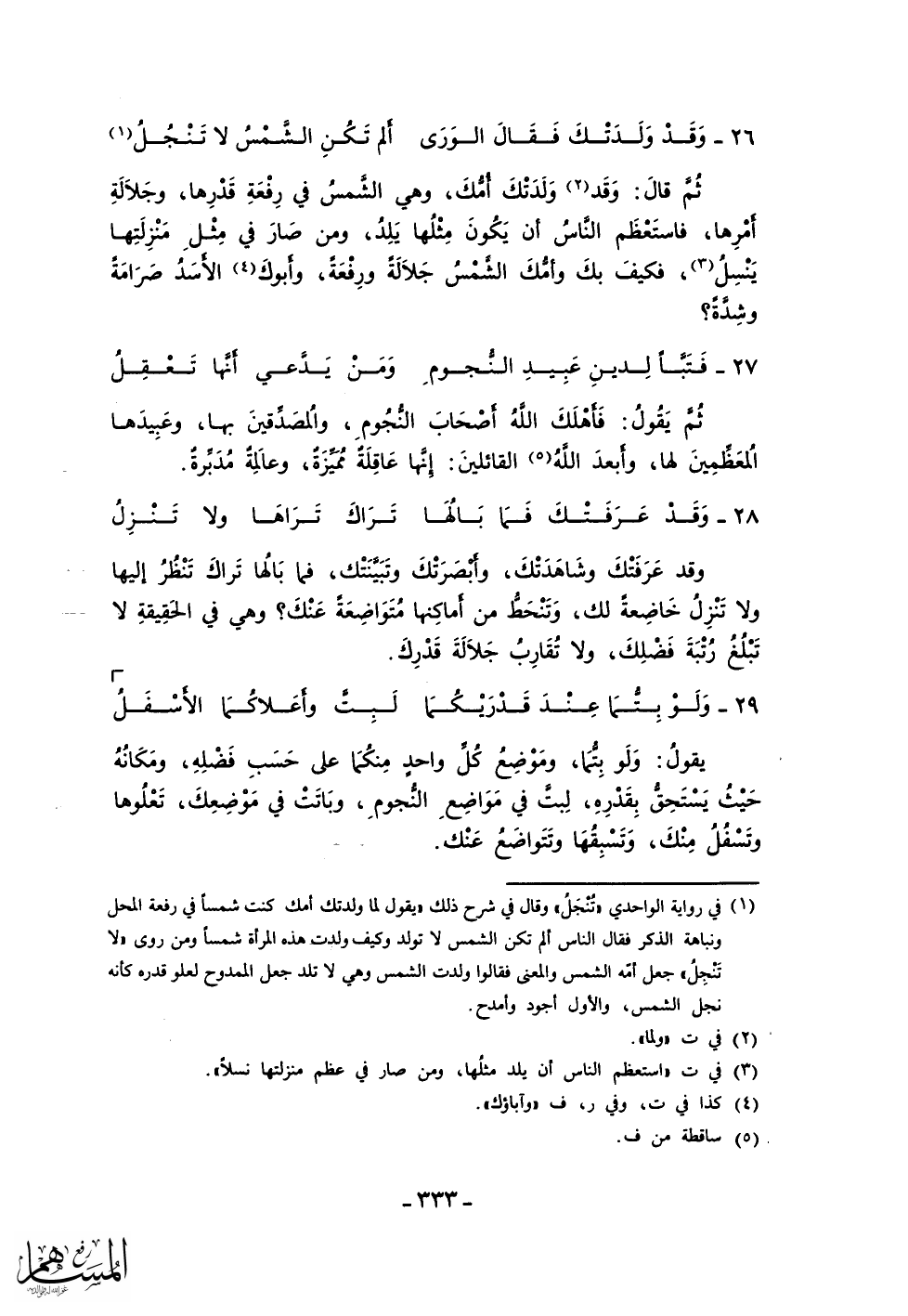 ثم يقول: فأهلك الله أصحاب النجوم، والمصدقين بها، وعبيدها المعظمين لها، وأبعد الله القائلين: إنها عاقلة مميزة، وعالية مدبرة.