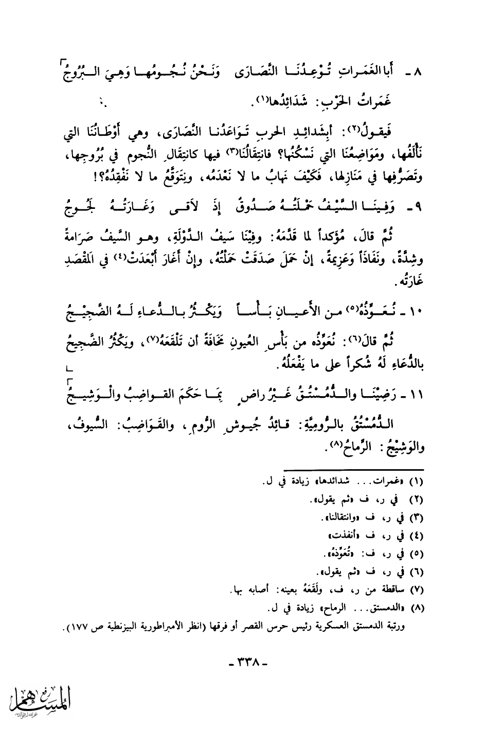 فيقول: أبشدائد الحرب تواعدنا النصارى، وهي أوطاننا التي نألفها، ومواضعنا التي نسكنها؟ فانتقالنا فيها كانتقال النجوم في بروجها، وتصرفها في منازلها، فكيف نهاب ما لا نعدمه، ونتوقع ما لا نفقده؟!