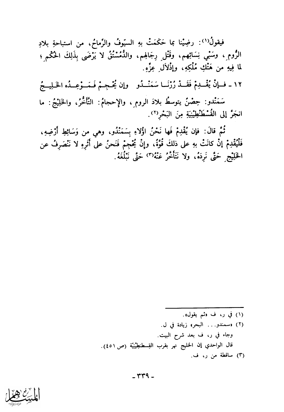 سمندو: حصن يتوسط بلاد الروم، والإحجام: التأخر، والخليج: ما انجر إلى القسطنطينية من البحر.