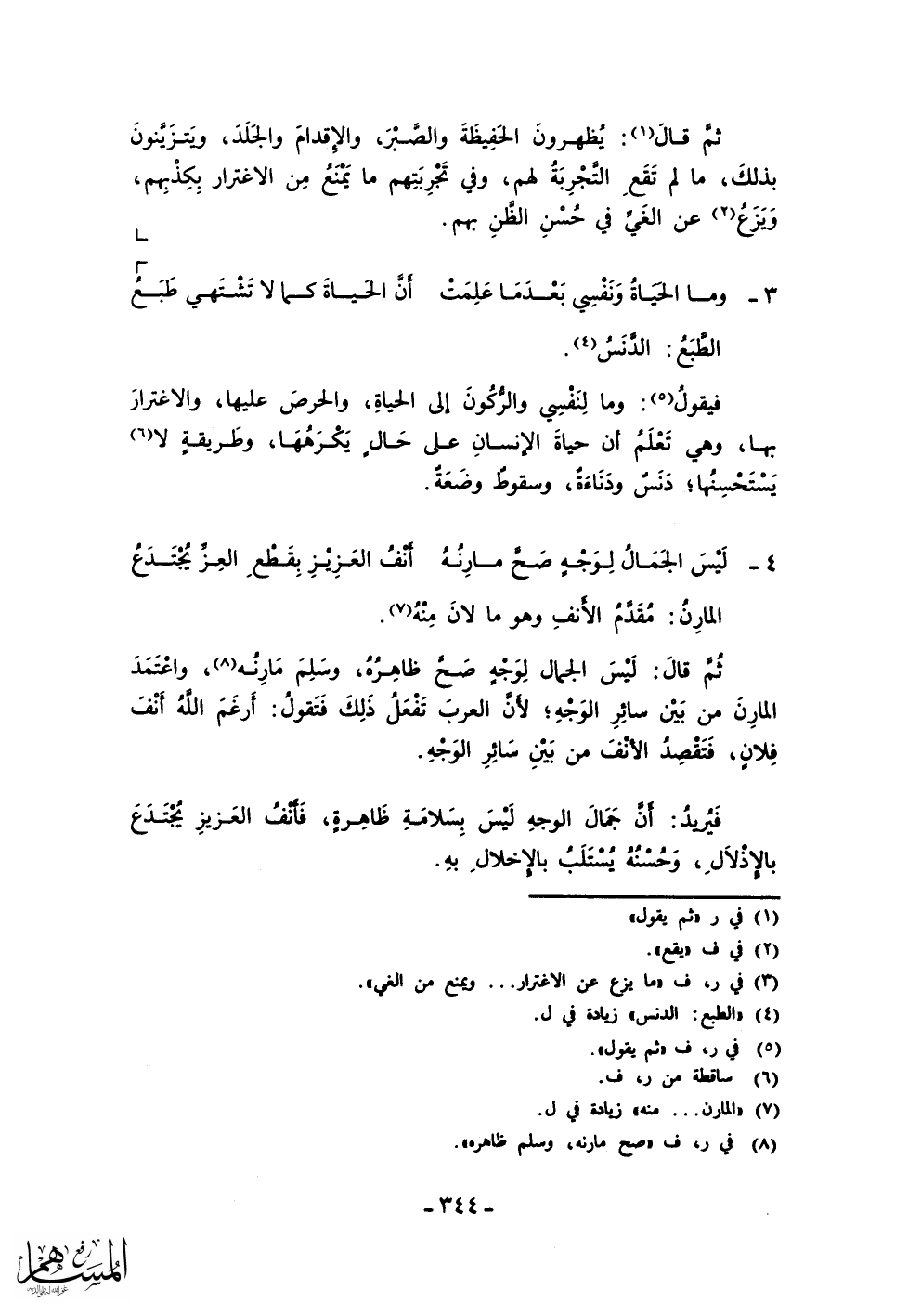 ثم قال: ليس الجمال لوجه صح ظاهره، وسلم مارنه، واعتمد المارن من بين سائر الوجه؛ لأن العرب تفعل ذلك فتقول: أرغم الله أنف فلان، فتقصد الأنف من بين سائر الوجه.