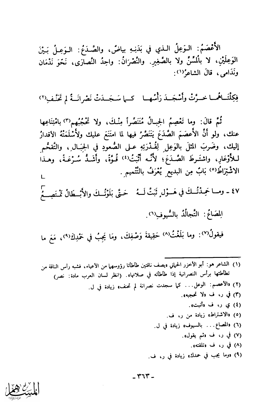 الأعصم: الوعل الذي في بدنه بياض، والصدع: الوعل بين الوعلين، لا بالمسن ولا بالصغير. والنصران: واحد النصارى، نحو ندمان وندامى، قال الشاعر: