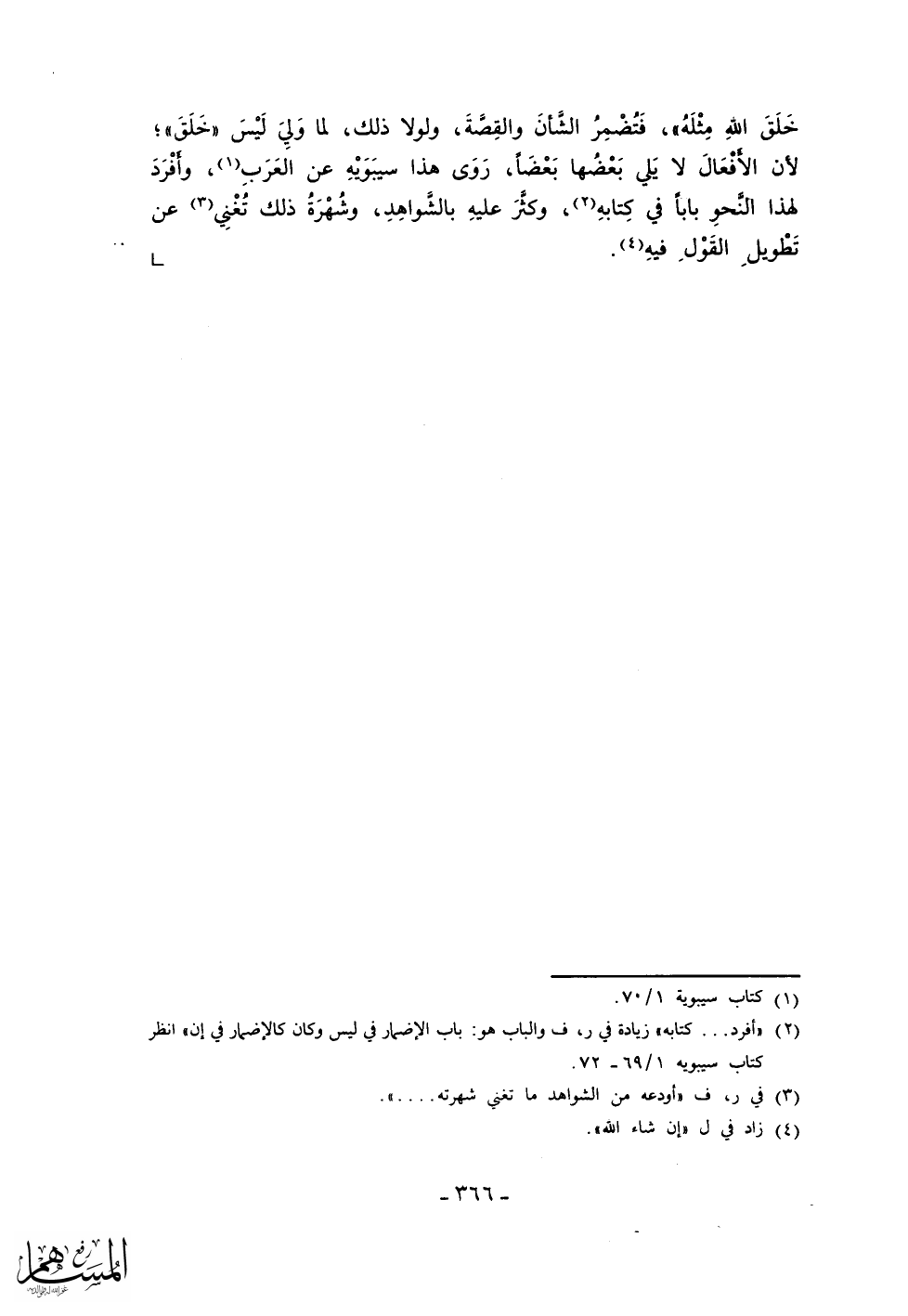 خلق الله مثله)، فتضمر الشأن والقصة، ولولا ذلك، لما ولي ليس (خلق)؛ لأن الأفعال لا يلي بعضها بعضاً، روى هذا سيبويه عن العرب، وأفرد لهذا النحو باباً في كتابه، وكثر عليه بالشواهد، وشهرة ذلك تغني عن تطويل القول فيه.
