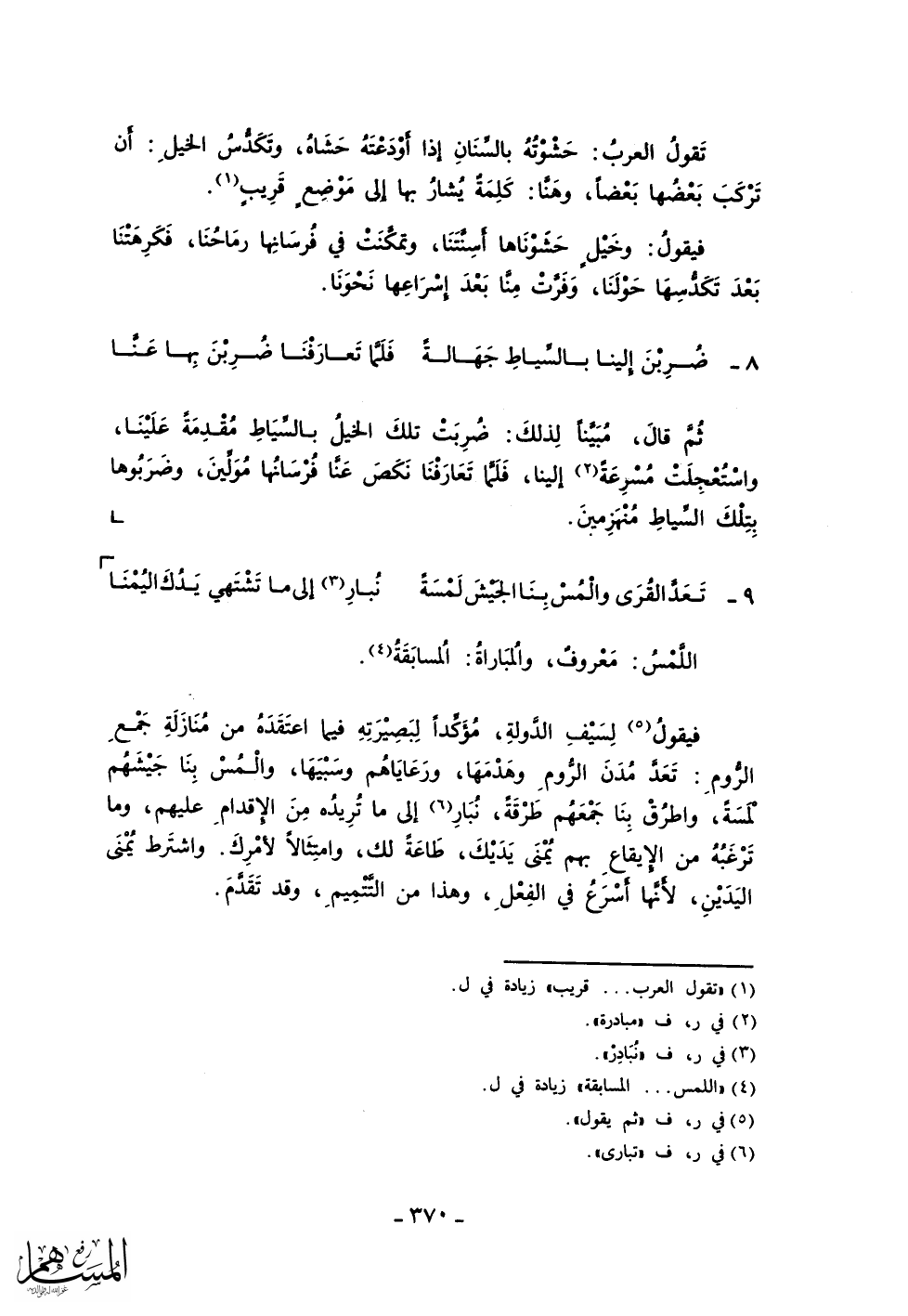 فيقول لسيف الدولة، مؤكداً لبصيرته فيما اعتقده من منازلته جمع الروم: تعد مدن الروم وهدمها، ورعاياهم وسبيها، والمس بنا جيشهم لمسة، واطراق بنا جمعهم طرقة، نبار إلى ما تريده من الإقدام عليهم، وما ترغبه من الإيقاع بهم يمنى يديك، طاعة لك، وامتثالاً لأمرك. واشترط يمنى اليدين، لأنها أسرع في الفعل، وهذا من التتميم، وقد تقدم.