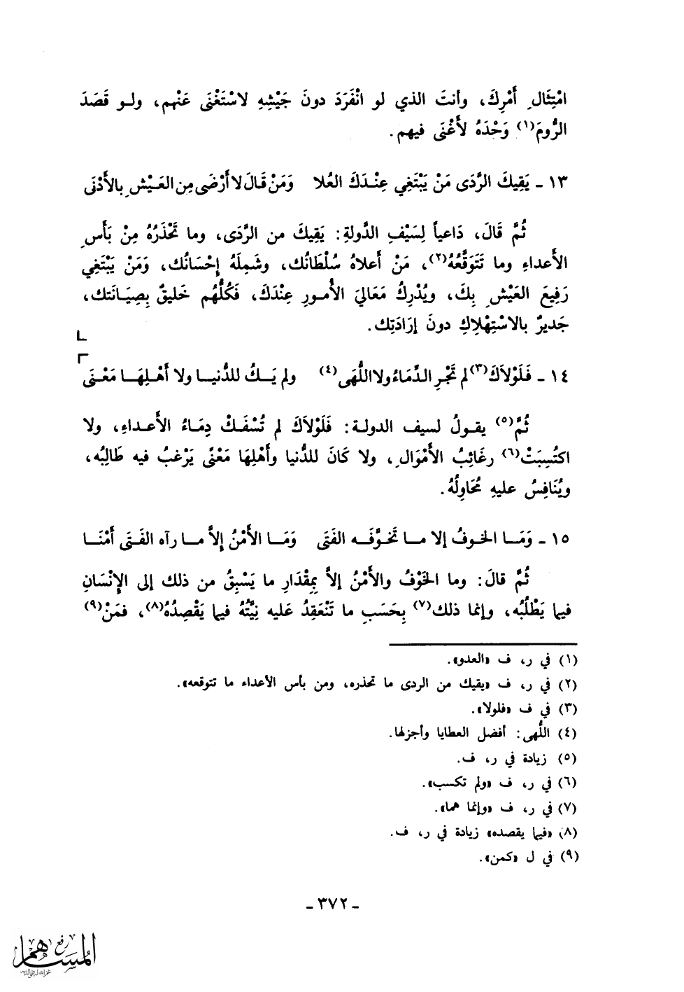 ثم قال، داعياً لسيف الدولة: يقيك من الردى، وما تحذره من بأس الأعداء وما تتوقعه، من أعلاه سلطانك، وشمله إحسانك، ومن يبتغي رفيع العيش بك، ويدرك معالي الأمور عندك، فكلهم خليق بصيانتك، جدير بالاستهلاك دون إرادتك.