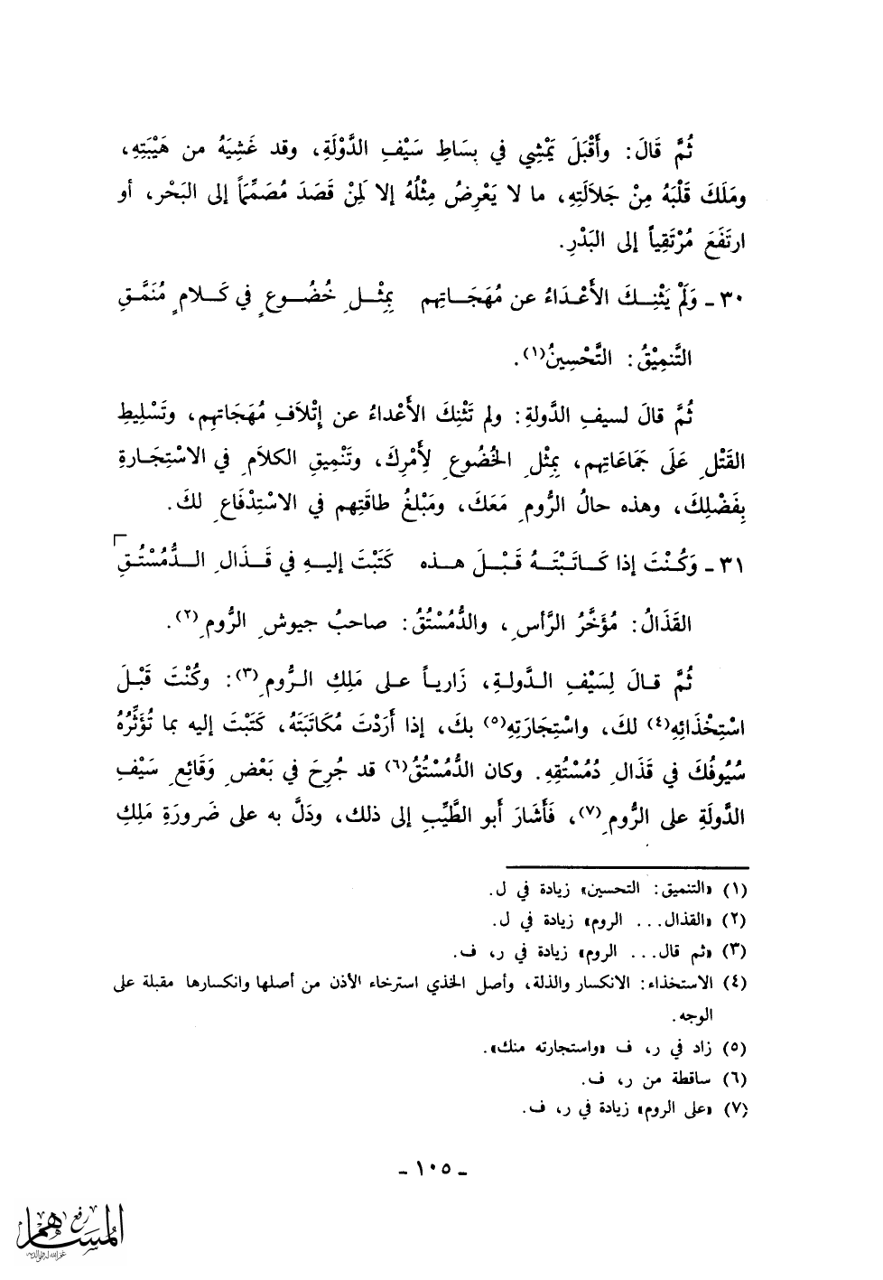 ثم قال لسيف الدولة: ولم تثنك الأعداء عن إتلاف مهجاتهم، وتسليط القتل على جماعاتهم، بمثل الخضوع لأمرك، وتنميق الكلام في الاستجارة بفضلك، وهذه حال الروم معك، ومبلغ طاقاتهم في الاستدفاع لك.