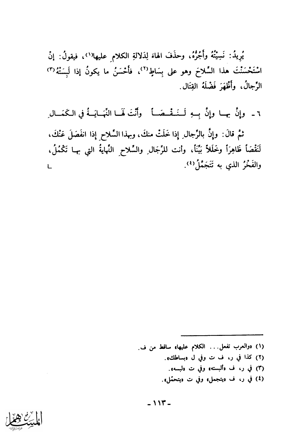 ثم قال: وإن بالرجال إذا خلت منك، وبهذا السلاح إذا انفصل عنك، لنقصاً ظاهراً وخللاً بينا، وأنت للرجال والسلاح النهاية التي بها تكمل، والفخر الذي به تتجمل.