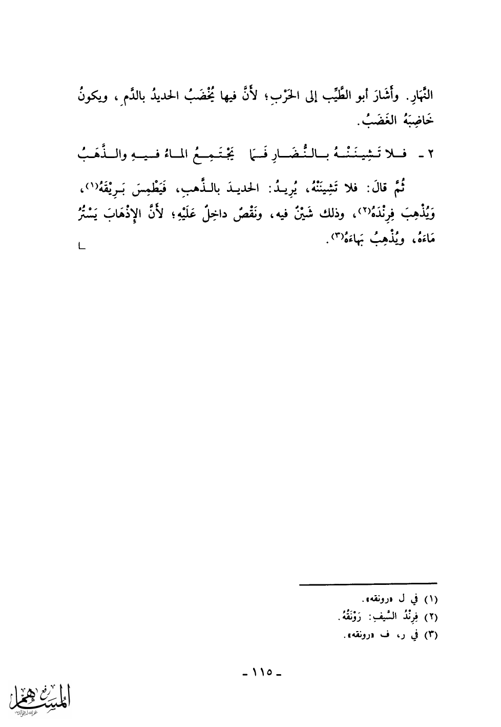 ثم قال: فلا تشيننه، يريد: الحديد بالذهب، فيطمس بريقه، ويذهب فرنده، وذلك شين فيه، ونقص داخل عليه؛ لأن الإذهاب يستر ماءه، ويذهب بهاءه.