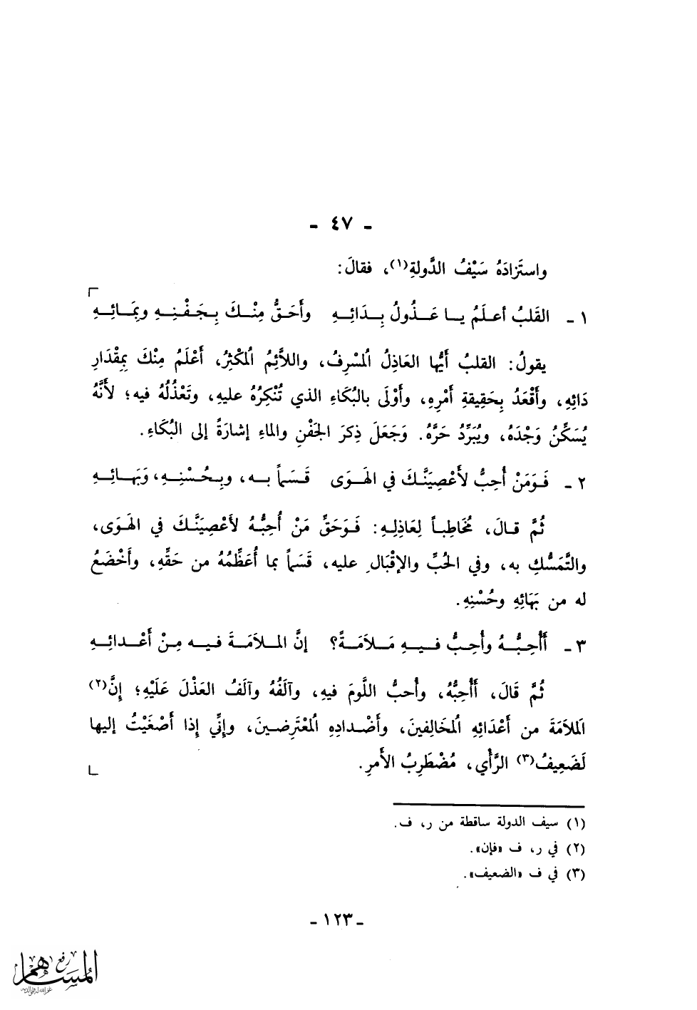 القَلبُ أعلَمُ يا عَذُولُ بِدَائِهِ ... وأَحَقُّ مِنْكَ بِجَفْنِهِ وبِمَائِهِ