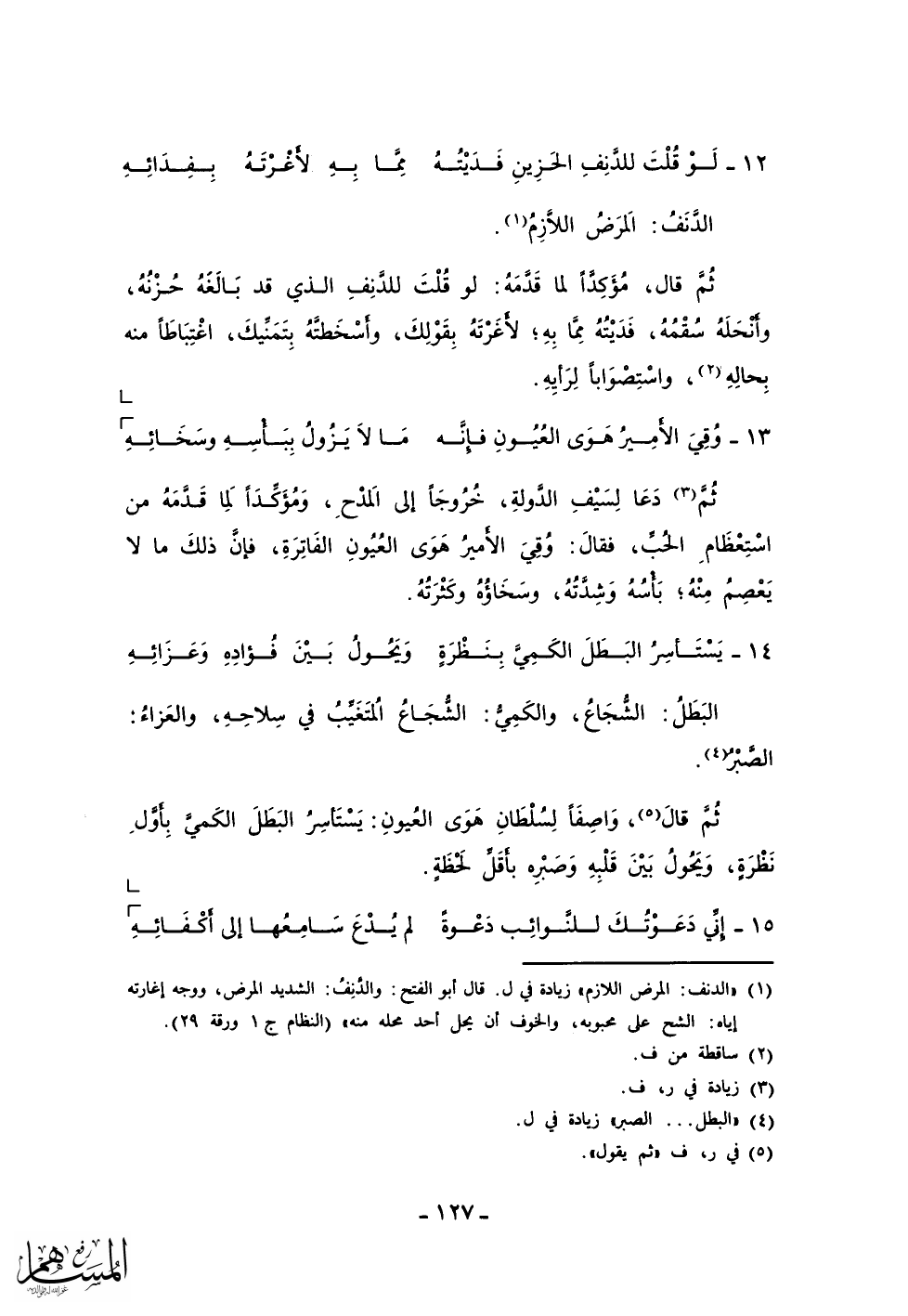 ثم دعا لسيف الدولة، خروجاً إلى المدح، ومؤكداً لما قدمه من استعظام الحب، فقال: وقي الأمير هوى العيون الفاترة، فإن ذلك ما لا يعصم منه؛ بأسه وشدته، وسخاؤه وكثرته.