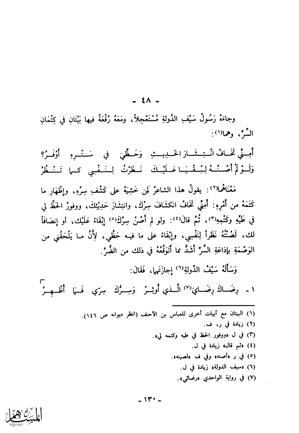 وجاءه رسول سيف الدولة مستعجلاً، ومعه رقعة فيها بيتان في كتمان السر، وهما: