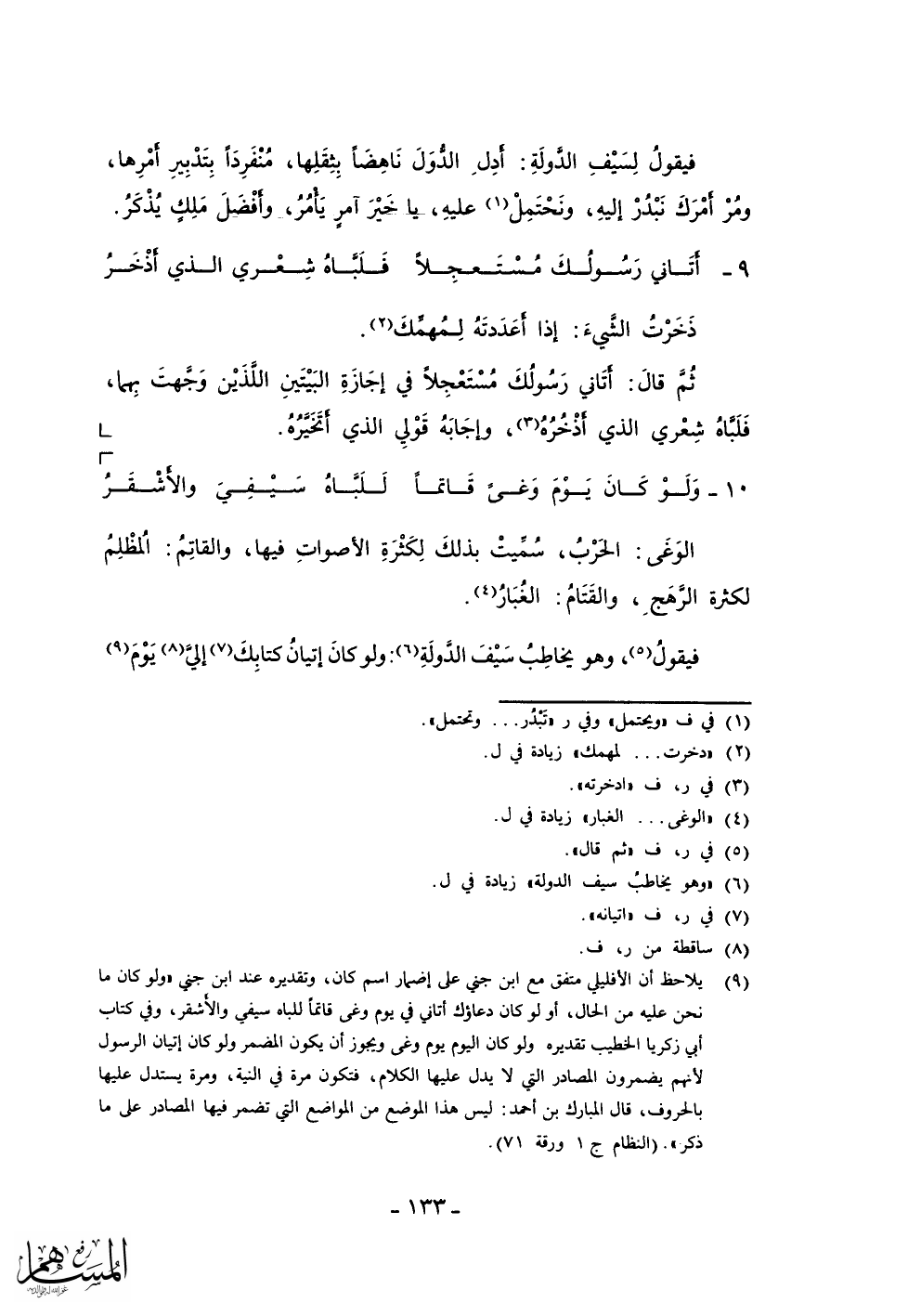 فيقول لسيف الدولة: أدل الدول ناهضاً بثقلها، منفرداً بتدبير أمرها، ومر أمرك نبدر إليه، ونحتمل عليه، يا خير آمر يأمر، وأفضل ملك يذكر.