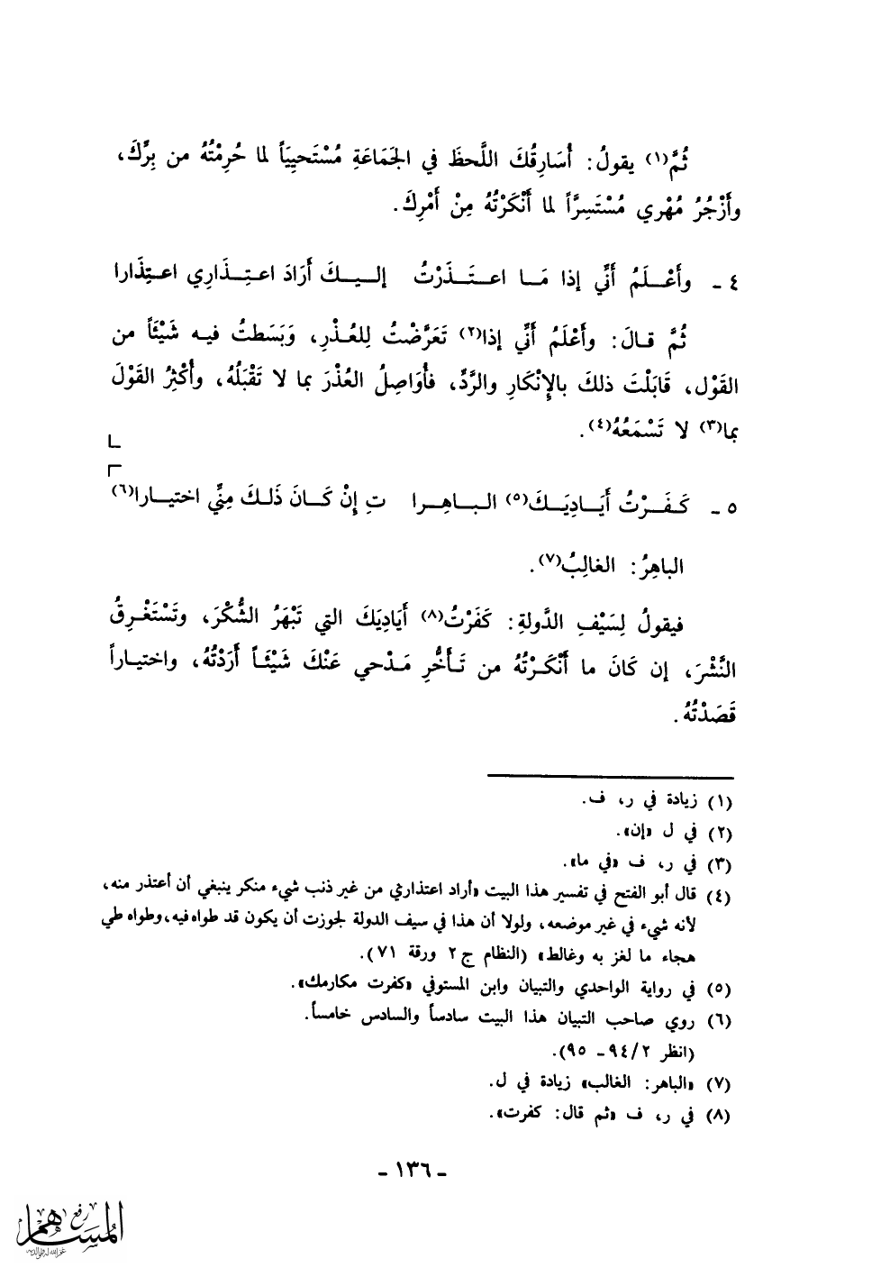 فيقول لسيف الدولة: كفرت أياديك التي تبهر الشكر، وتستغرق النشر، إن كان ما أنكرته من تأخر مدحي عنك شيئاً أردته، واختياراً قصدته.