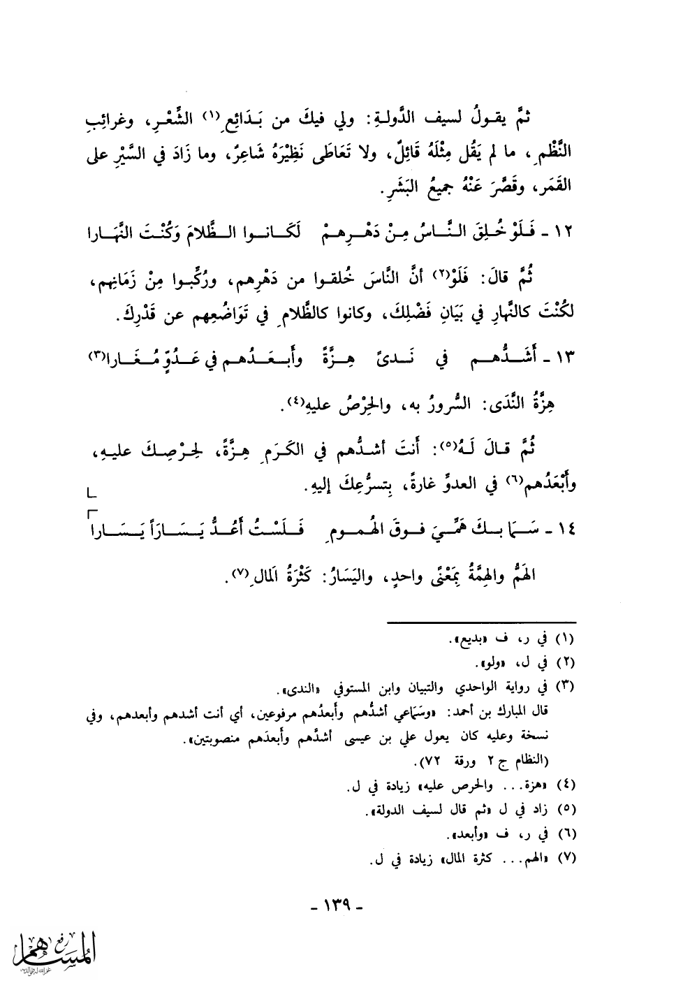 ثم يقول لسيف الدولة: ولي فيك من بدائع الشعر، وغرائب النظم، ما لم يقل مثله قائل، ولا تعاطى نظيره شلعر، وما زاد في السير على القمر، وقصر عنه جميع البشر.