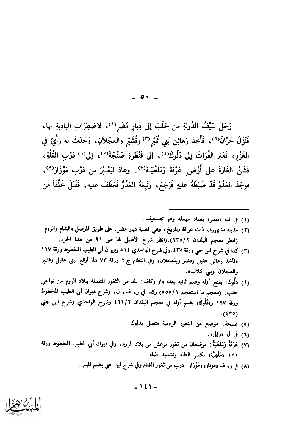 رحل سيف الدولة من حلب إلى ديار مضر، لاضطراب البادية بها، فنزل حران، فأخذ رهائن بني نمير وقشير والعجلان، وحدث له رأي في الغزو، فعبر الفرات إلى دلوك، إلى قنطرة صنجة، إلى درب القلة، فشن الغارة على أرض عرقة وملطية. وعاد ليعبر من درب موزار، فوجد العدو قد ضبطه عليه فرجع، وتبعه العدو فعطف عليه، فقتل خلقاً من