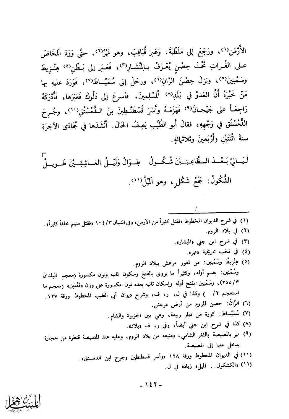 الأرمن، ورجع إلى ملطية، وعبر قباقب، وهو نهر، حتى ورد المخاض على الفرات تحت حصن يعرف بالمنشار، فعبر إلى بطن هنزيط وسمنين، ونزل حصن الران، ورحل إلى سميساط، فورد عليه بها من خبره أن العدو في بلد المسلمين، فأسرع إلى دلوك فعبرها، فأدركه راجعاً على جيحان فهزمه وأسر قسطنطين بن الدمستق، وجرح الدمستق في وجهه، فقال أبو الطيب يصف الحال. أنشدها في جمادى الآخرة سنة اثنتين وأربعين وثلاثمائة.