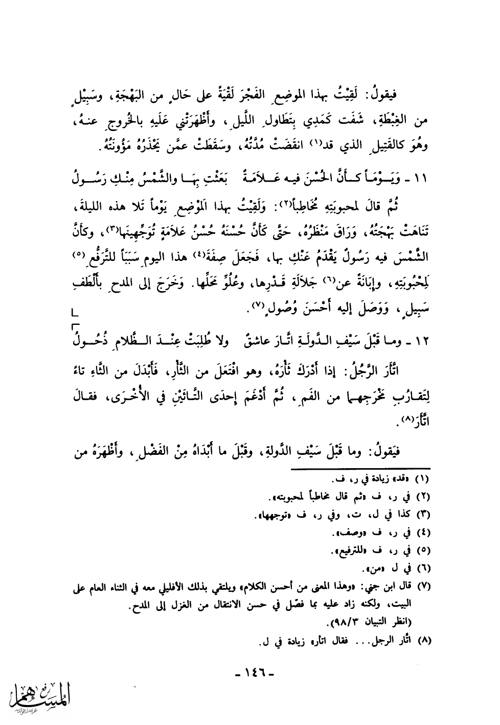 ثم قال لمحبوبته مخاطباً: ولقيت بهذا الموضع يوماً تلا هذه الليلة تناهت بهجته، وراق منظره، حتى كأن حسنه حسن علامة توجهينها، وكأن الشمس فيه رسول يقدم عنك بها، فجعل صفة هذا اليوم سبباً للترفع لمحبوبته، وإبانة عن جلالة قدرها، وعلو محلها. وخرج إلى المدح بألطف سبيل، ووصل إليه أحسن وصول.