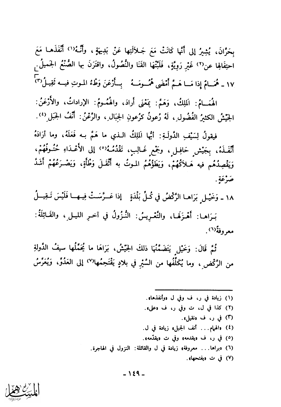 ثم قال: وخيل يتضمنها ذلك الجيش، براها ما يحملها سيف الدولة من الركض، وما يكلفها من السير في بلاد يقتحمها إلى العدو، ويعرس
