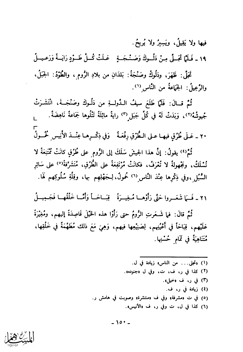 ثم يقول: إن هذا الجيش سلك إلى الروم على طرق كانت ممتنعة لا تسلك، ومجهولة لا تعرف، فكانت مرتفعة على الطرق، متشرفة على سائر السبل، وفي ذكرها عند الناس خمول، لجهلهم بها، وقلة سلوكهم لها.