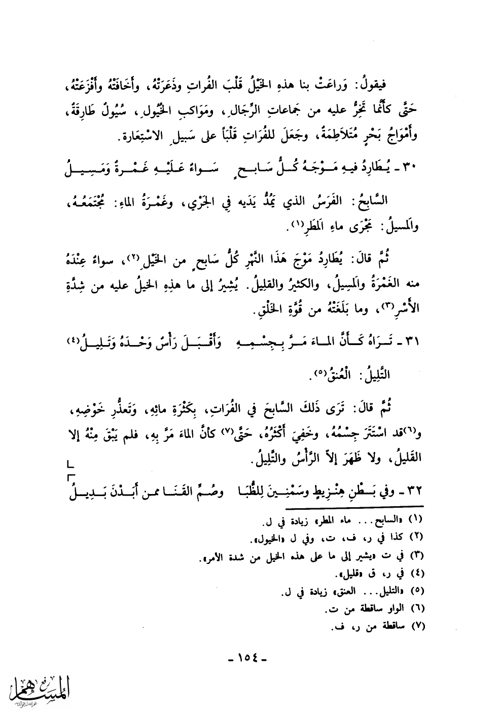 ثم قال: يطارد موج هذا النهر كل سابح من الخيل، سواء عنده منه الغمرة والمسيل، والكثير والقليل. يشير إلى ما هذه الخيل عليه من شدة الأسر، وما بلغته من قوة الخلق.