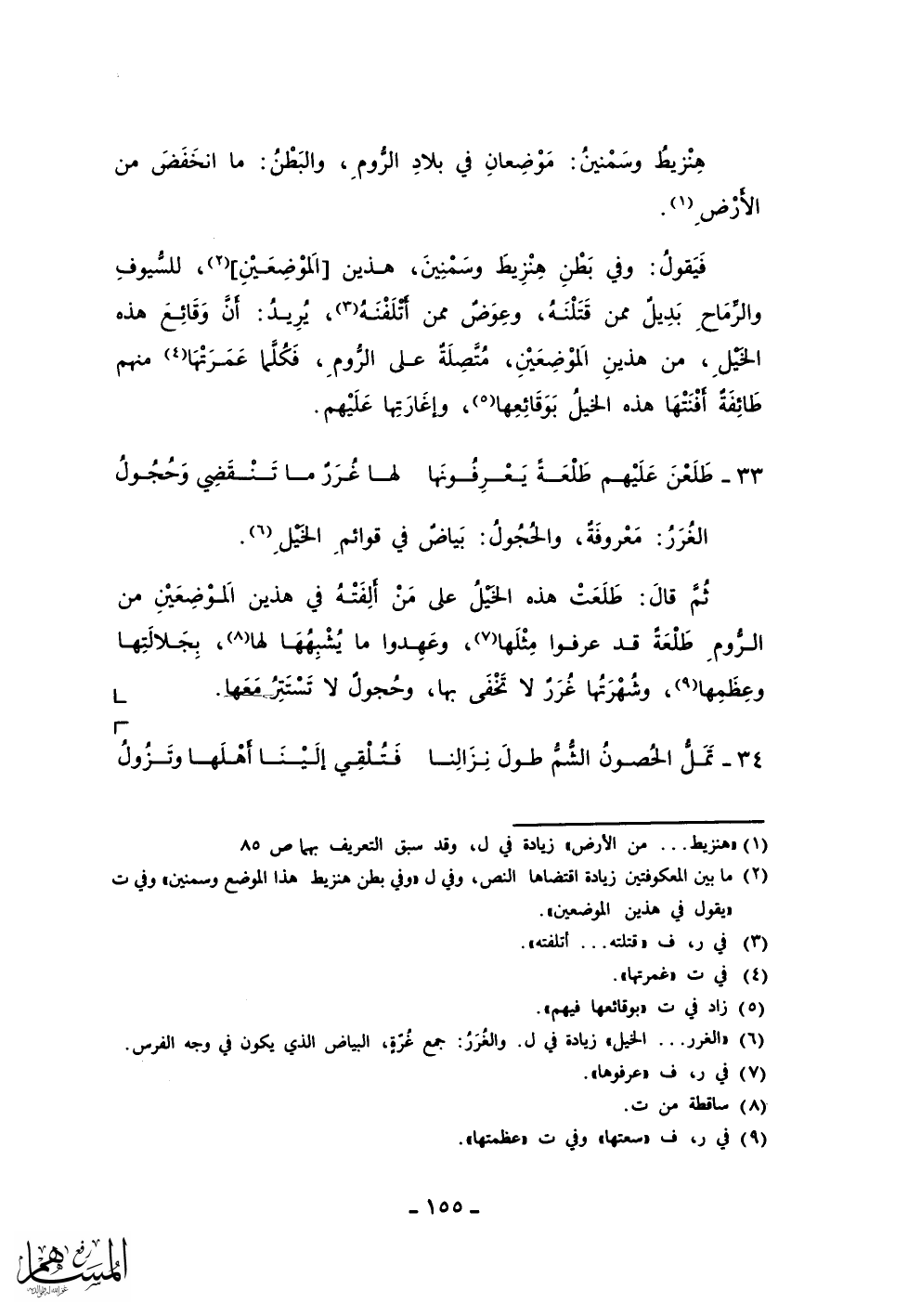 فيقول: وفي بطن هنزيط وسمنين، هذين (الموضعين)، للسيوف والرماح بديل ممن قتلنه، وعوض ممن أتلفنه، يريد: أن وقائع هذه الخيل، من هذين الموضعين، متصلة على الروم، فكلما عمرتها منهم طائفة أفنتها هذه الخيل بوقائعها، وإغارتها عليهم.