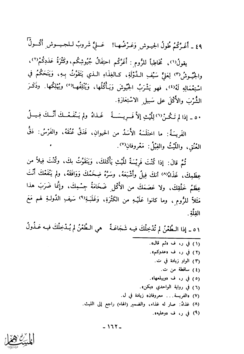 ثم قال: إذا كنت فريسة لليث يأكلك، ويتقوتبك، وكنت فيلاً من عظمك، غذاة أنك فيل وأشبعه، وسره ضخمك ووافقه، ولم ينفعك أنت عظم خلقك، ولا عصمك من الأكل ضخامة جسمك، وإنما ضرب هذا مثلاً للروم، وما كانوا عليه من الكثرة، وغلبه سيف الدولة لهم مع القلة.