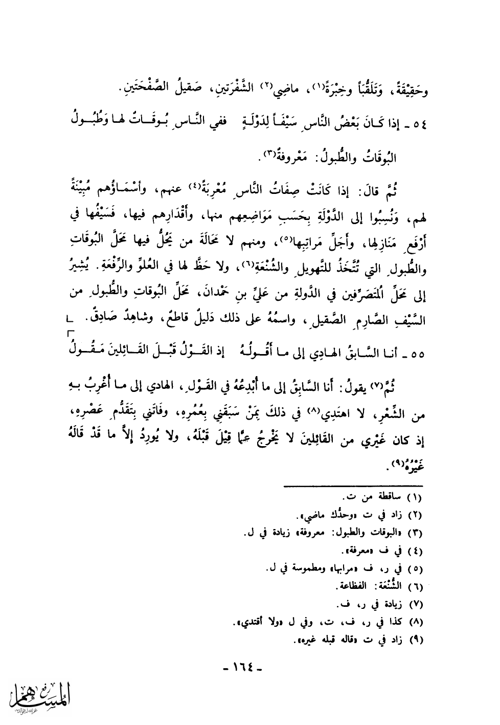 ثم قال: إذا كانت صفات الناس معربة عنهم، وأسماؤهم مبينة لهم، ونسبوا إلى الدولة بحسب مواضعهم منها، وأقدارهم فيها، فسيفها في أرفع منازلها، وأجل مراتبها، ومنهم لا محالة من يحل فيها محل البوقات والطبول التي تتخذ للتهويل والشنعة، ولاحظ لها في العلو والرفعة. يشير إلى محل المتصرفين في الدولة من علي بن حمدان، محل البوقات والطبول من السيف الصارم الصقيل، واسمه على