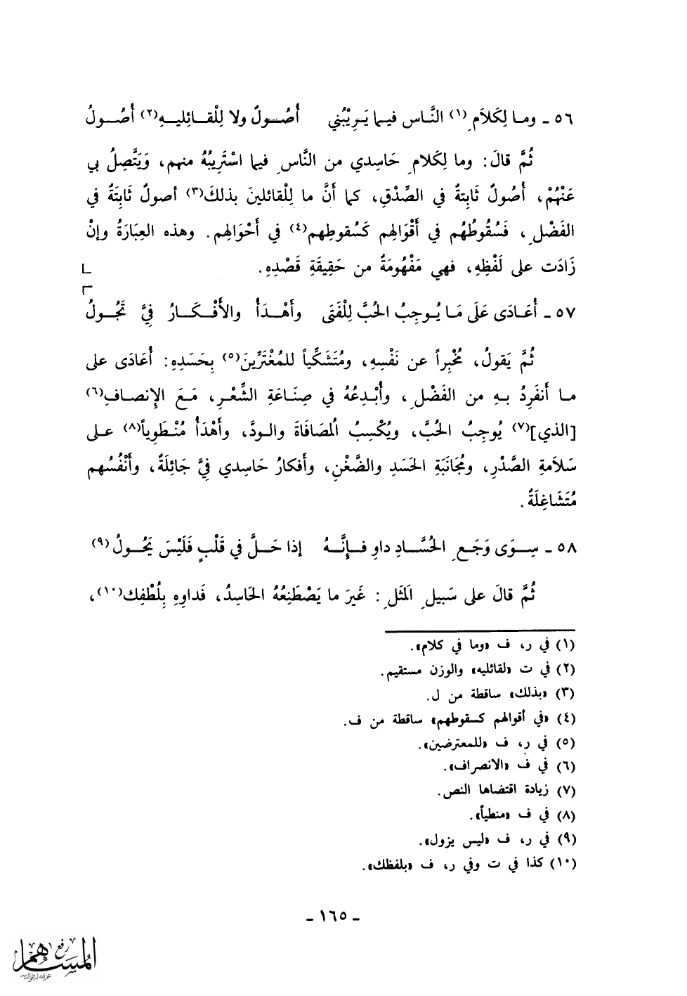 ثم قال: وما لكلام حاسدي من الناس فيما أستريبه منهم، ويتصل بي عنهم، أصول ثابتة في الصدق، كما أن ما للقائلين بذلك أصول ثابتة في الفضل، فسقوطهم في أقوالهم كسقوطهم في أحوالهم. وهذه العبارة وإن زادت على لفظه، فهي مفهومة من حقيقة قصده.