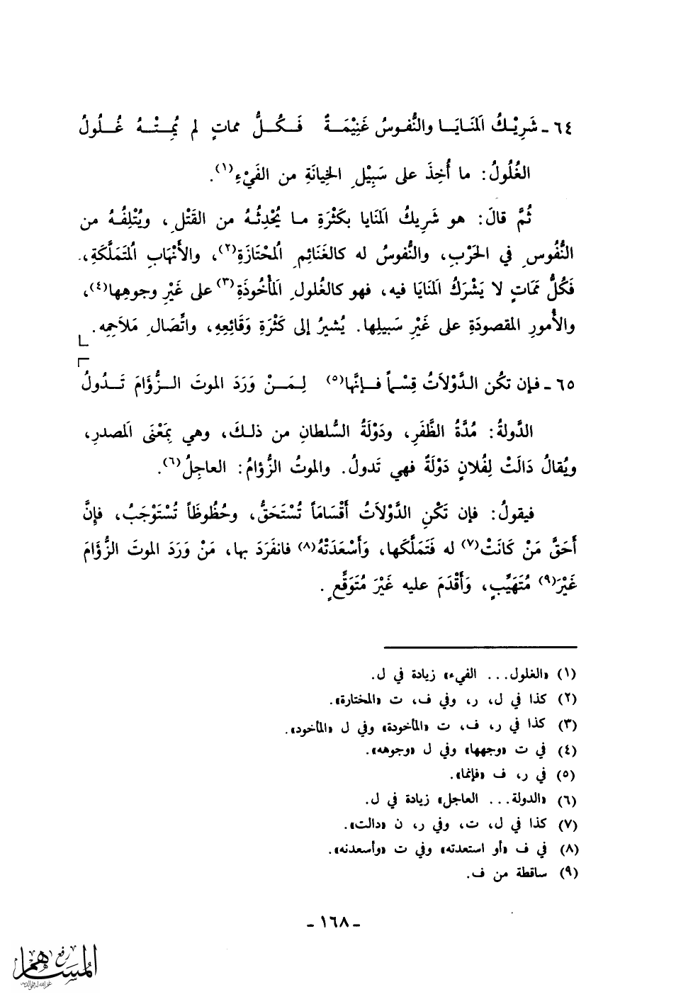 شَرِيْكُ المَنَايَا والنُّفوسُ غَنْيمةُ ... فَكُلُّ مماتٍ لم يُمِيتْهُ غُلُولُ