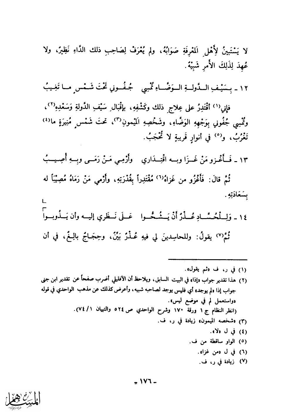 فإني أقتدر على علاج ذلك وكشفه، بإقبال سيف الدولة وسعده، وتمسي جفوني يوجهه الوضاء، وشخصه الميمون، تحت شمس منيرة ما تغرب، وفي أنوار قريبة لا تحجب.