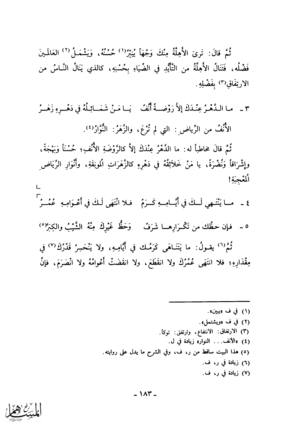 ما الدَّهْرُ عِنْدَكَ إلاَّ رَوْضةُ أُنْفُ ... يَا مَنْ شَمَائِلهُ في دَهرِهِ زَهَرُ