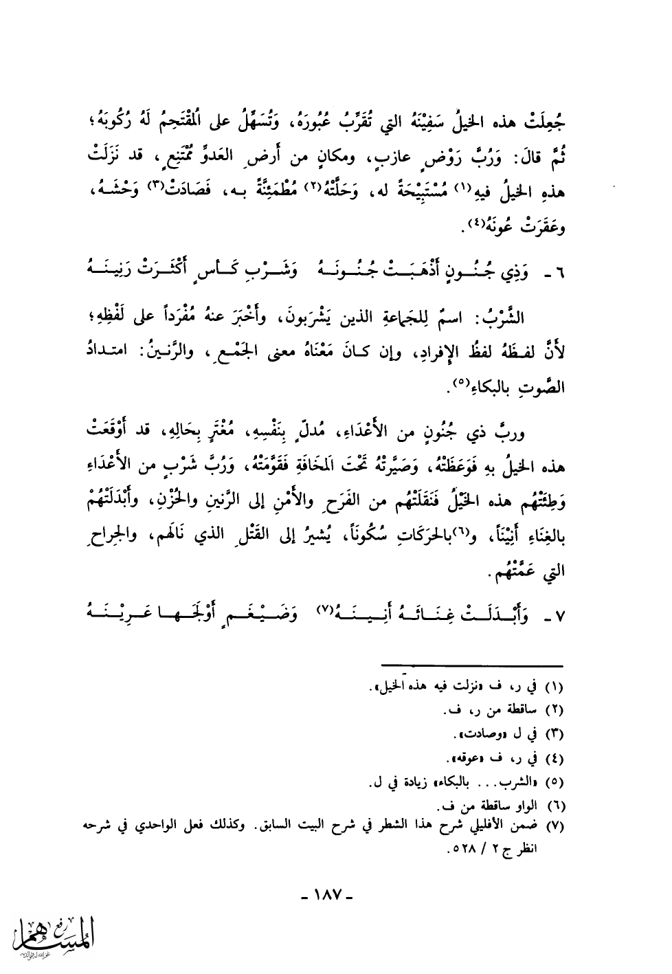 ورب ذي جنون من الأعداء، مدل بنفسه، مغتر بحاله، قد أوقعت هذه الخيل به فوعظته، وصيرته تحت المخافة فقومته، ورب شرب من الأعداء وطئتهم هذه الخيل فنقلتهم من الفرح والأمن إلى الرنين والحزن، وأبدلتهم بالغناء أنينا، وبالحركات سكوناً، يشير إلى القتل الذي نالهم، والجراح التي عمتهم.