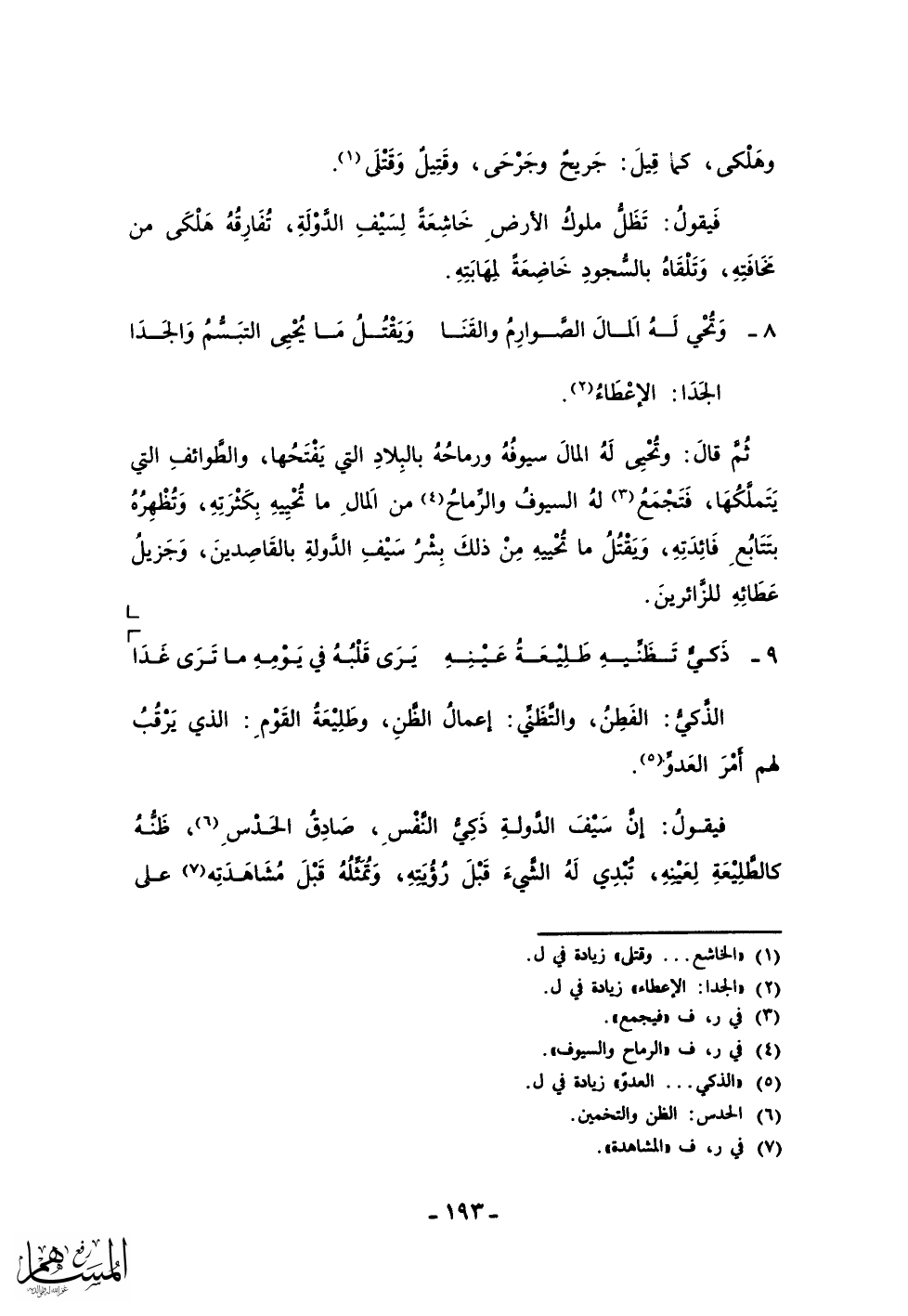 ثم قال: وتحيى له المال سيوفه ورماحه بالبلاد التي يفتحها، والطوائف التي يتملكها، فتجمع له السيوف والرماح من المال ما تحييه بكثرته، وتظهره بتتابع فائدته، ويقتل ما تحييه من ذلك بشر سيف الدولة بالقاصدين، وجزيل عطائه للزائرين.